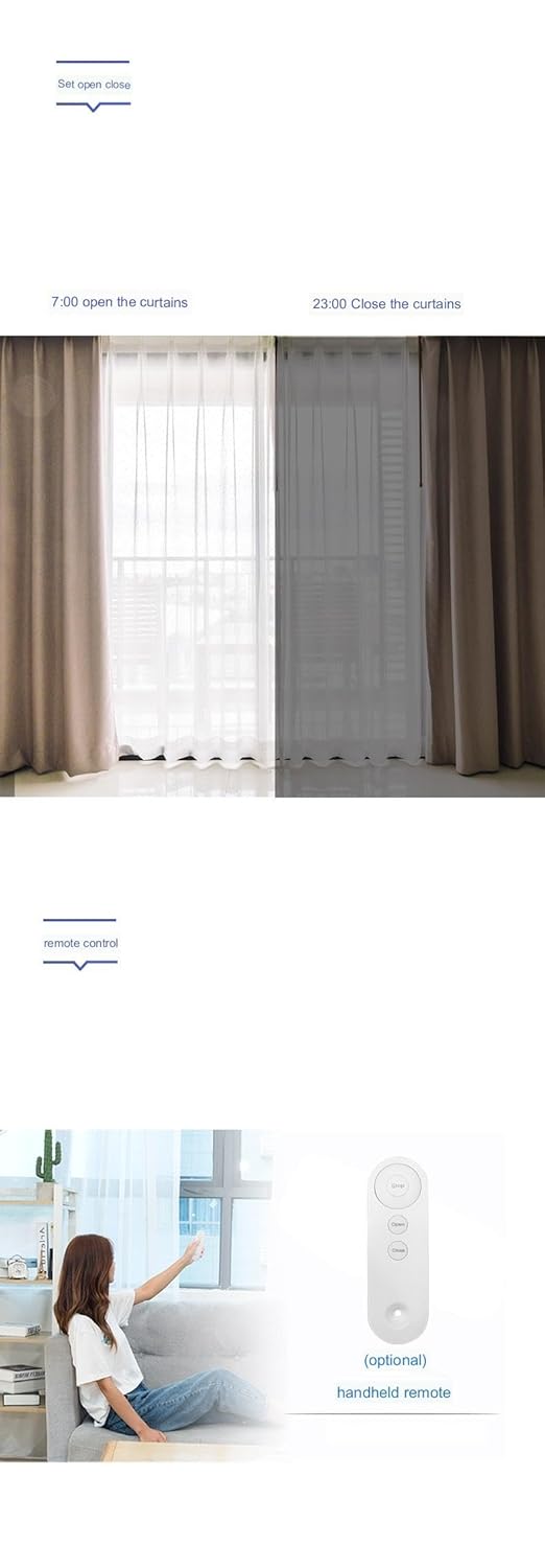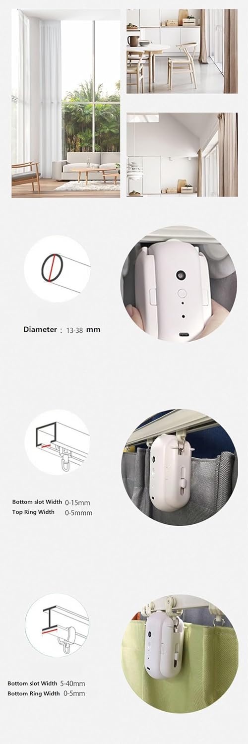Transform your living space with our Electric Curtain Opener, a cutting-edge smart home device that enhances convenience and automation for your curtains or blinds. Designed for seamless integration, this opener is compatible with a variety of smart home accessories, allowing you to control your window treatments effortlessly from your smartphone or with simple voice commands. Imagine waking up to natural sunlight pouring into your room, or easily adjusting the atmosphere for movie night—all at the touch of a button. With its intuitive timer feature, you can pre-set your curtains to open or close at specific times, ensuring your home is always filled with the right ambiance. Installation is quick and straightforward, making it ideal for anyone looking to elevate their smart home experience. This electric curtain opener is designed to fit various window types and is easily connectable to your existing setup. Plus, with its USB charging capability, you no longer have to worry about changing batteries, providing a reliable and sustainable solution. Not only does this electric curtain opener automate your living space, but its sleek, modern design also adds a sophisticated touch to your home decor. Enhance both functionality and aesthetics with this versatile addition that complements any interior style. Embrace the future of home automation and enjoy the perfect blend of comfort, style, and convenience.