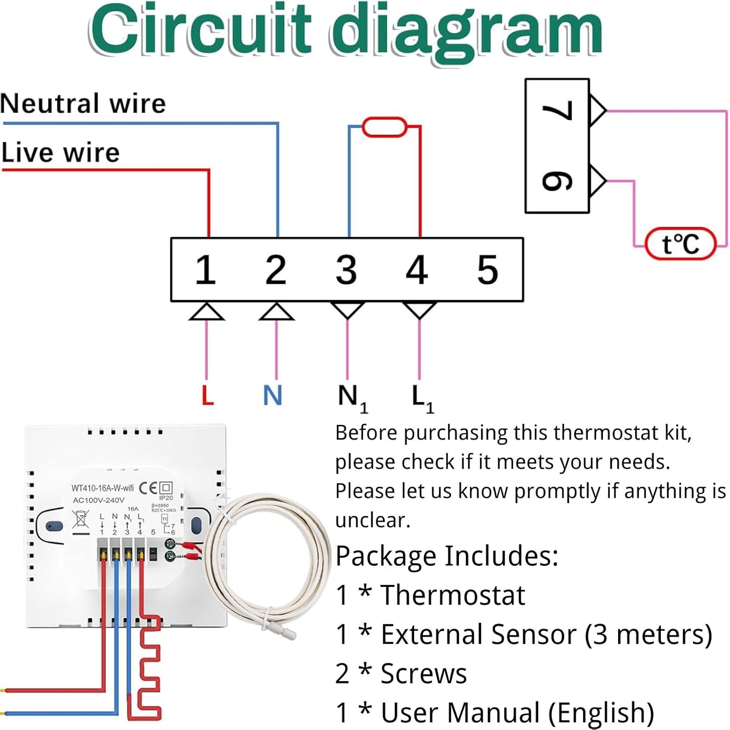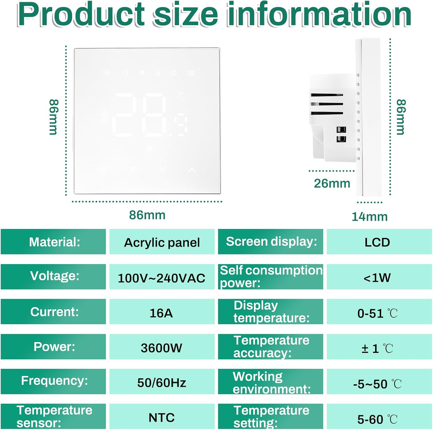 5. 【High Accuracy】 The thermostat has a temperature accuracy of ± 1°C and operates in a temperature range of 5-60°C. It supports voltages from 100V to 240V AC, 50/60Hz, with a rated current of 16A and a rated power of 3600W. The thermostat incorporates a NTC temperature sensor and comes with a 3m external temperature probe for precise indoor temperature regulation.