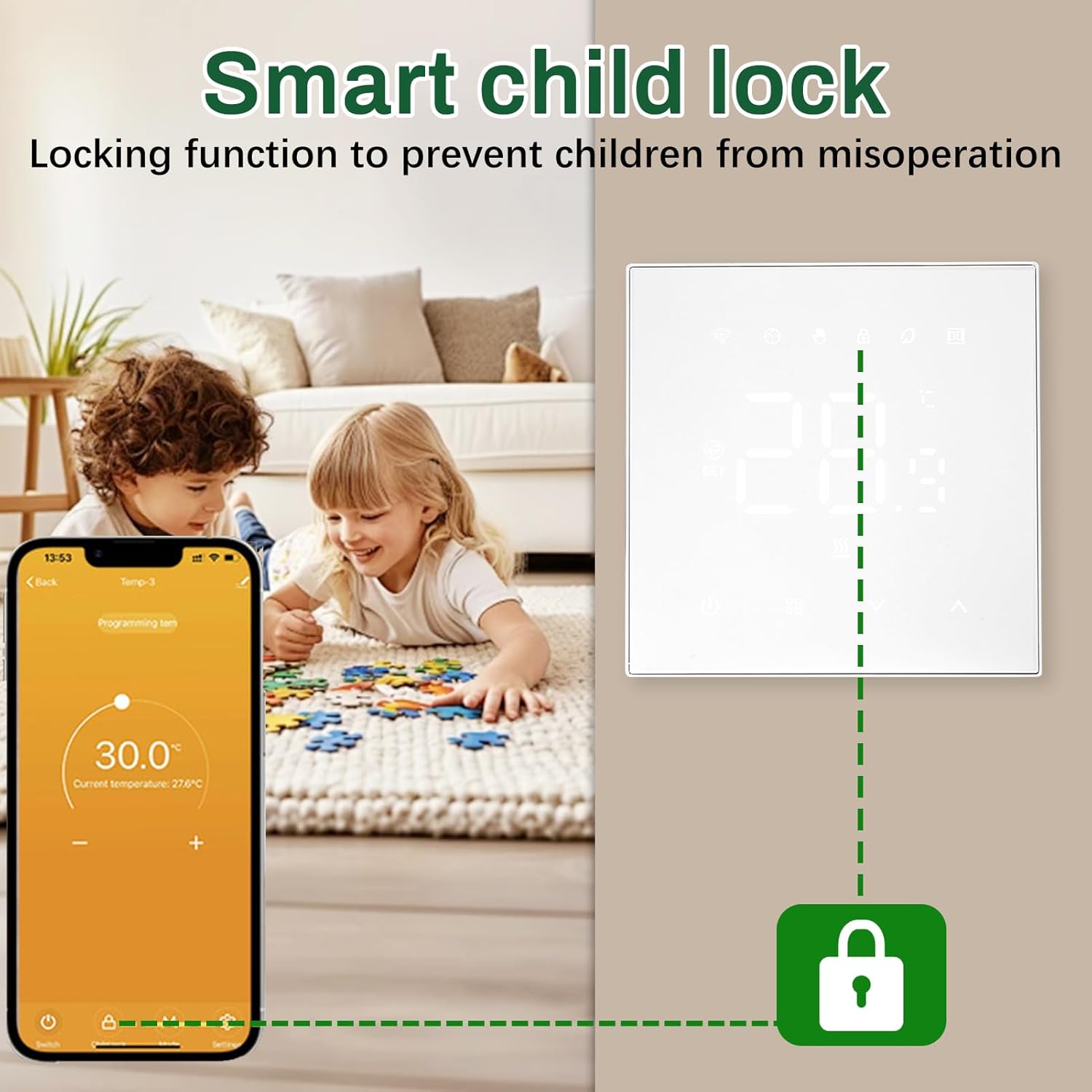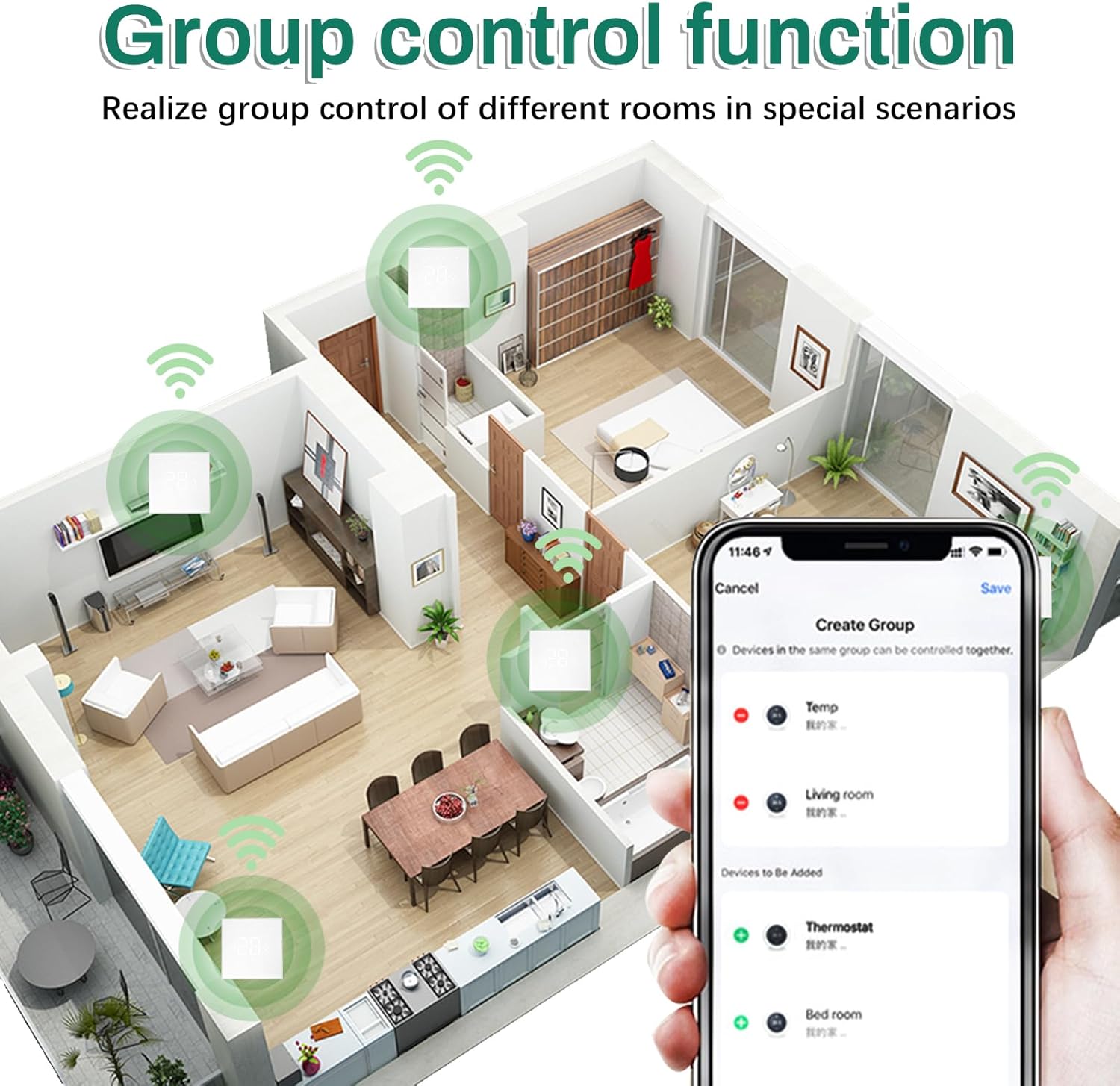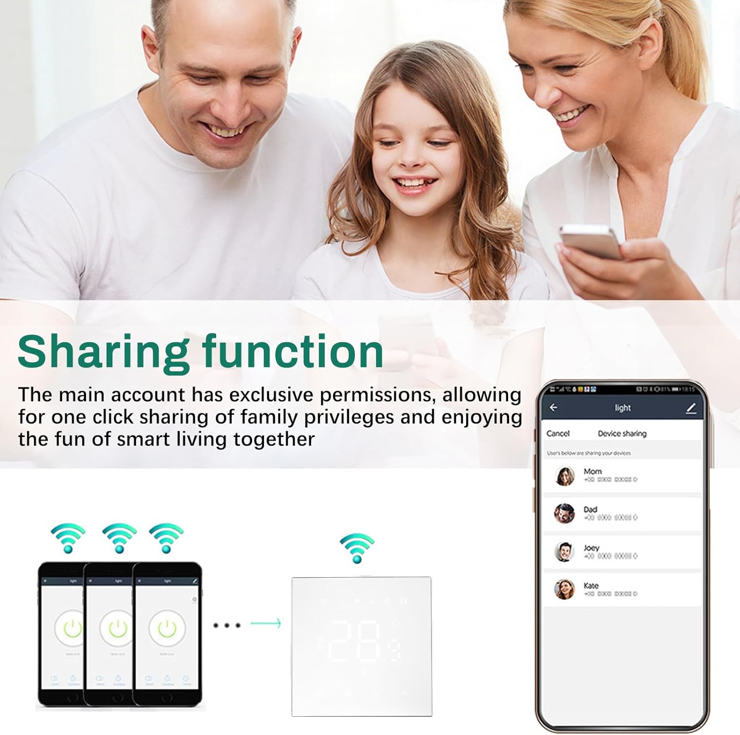 4. 【Safe to use】 With the lock protection, this smart thermostat can prevent malfunction and unintentional temperature change. Additional features include temperature calibration, frost protection, backlight brightness adjustment, group control, and sharing functions.
