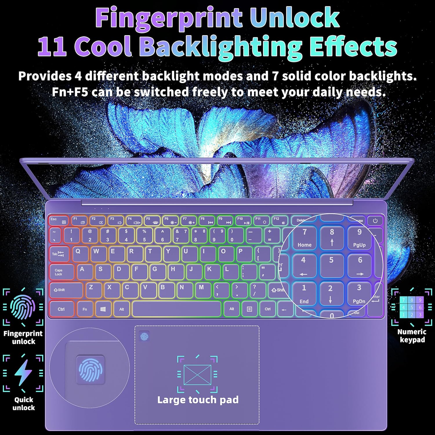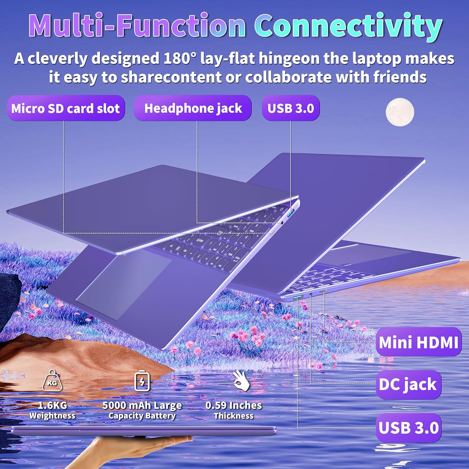 ✨💻⌨️Versatility+Ports+Long Battery Life: Enjoy a 7-color backlit keyboard, fingerprint recognition, and a variety of ports including USB3.0, headphone jack, DC jack, Micro SD, and mini HDMI. The 5000mAh battery ensures extended use, while the laptop’s versatility and connectivity cater to your on-the-go lifestyle.💜