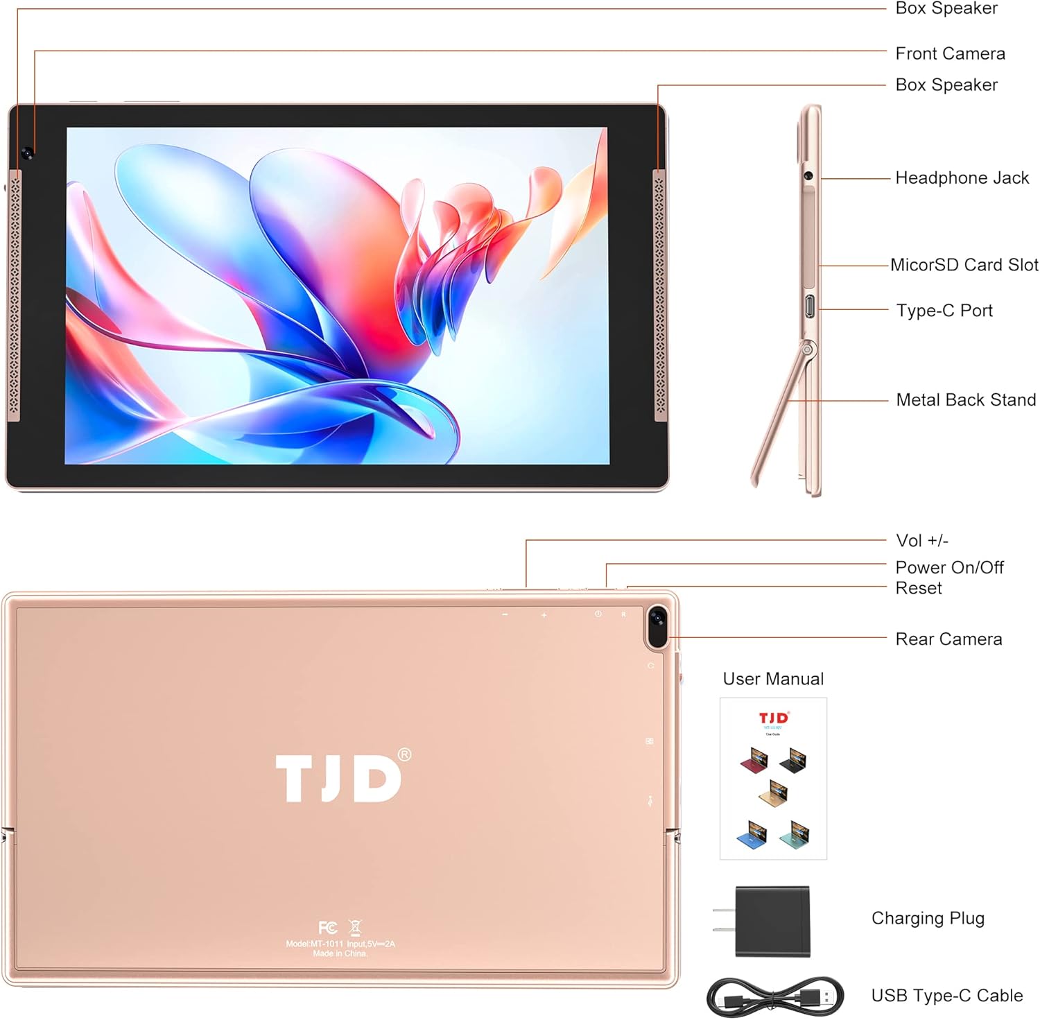 TJD 1011QU is designed with a High-performance CPU. It is geared for multitasking, fast switch between apps and tasks for movies, videos, and games.Whether you re watching videos, browsing the web, or listening to music, your experience will be smooth and seamless.The tablet has been authenticated with GMS. In addition to experiencing stable and smooth services, you can install your favourite third-party apps.Enjoy extremely smooth streaming on your tablet with 8GB RAM, space to store all your important photos, videos and apps with 128 GB of storage space and Micro SD expansion.Back with stand to free your hands.Large 10.1″ IPS HD+ Screen, 800*1280,Perfect display,allows you to watch 1080P or more HD content on more apps.The built-in 6000 mAh battery of the wifi tablet is rechargeable efficiently, normal working hours can last around 7-8 hours.