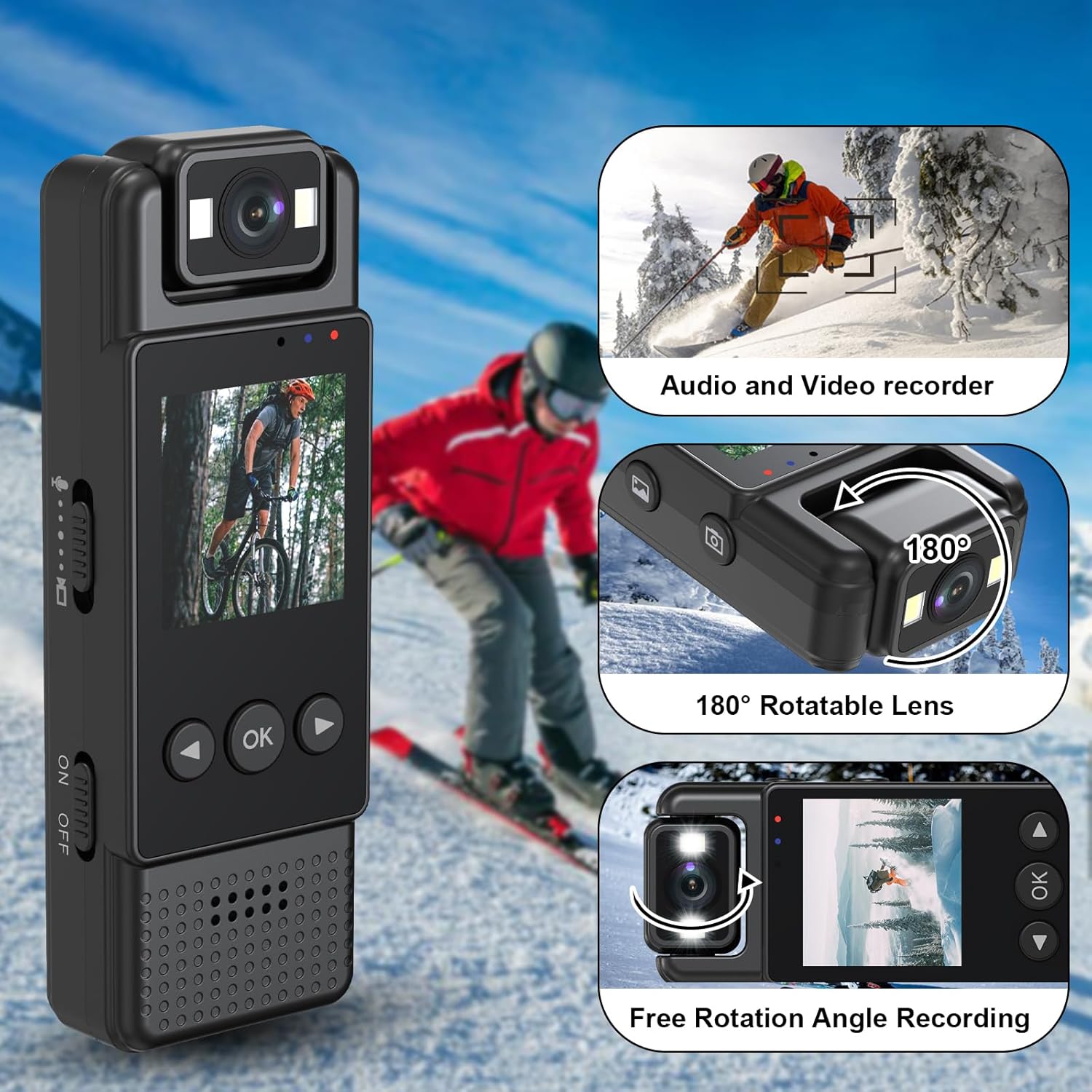 Capture every detail in stunning clarity with 1080P video resolution. So you can relive your adventures or document important events in exceptional quality. The 180° rotating lens offers unparalleled flexibility that allows you to adjust the shooting angle effortlessly.
