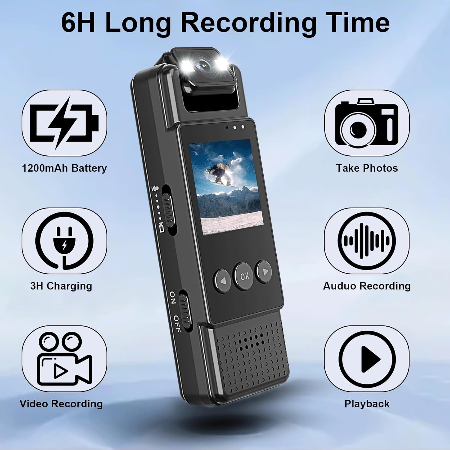 6 HR battery life/fast recording: The small body camera with audio & video recorder is equipped with a 1200 mAh battery, which can last almost 6 HR working time. Just press your thumb to start recording and you don’t have to worry about missing what you want to record.