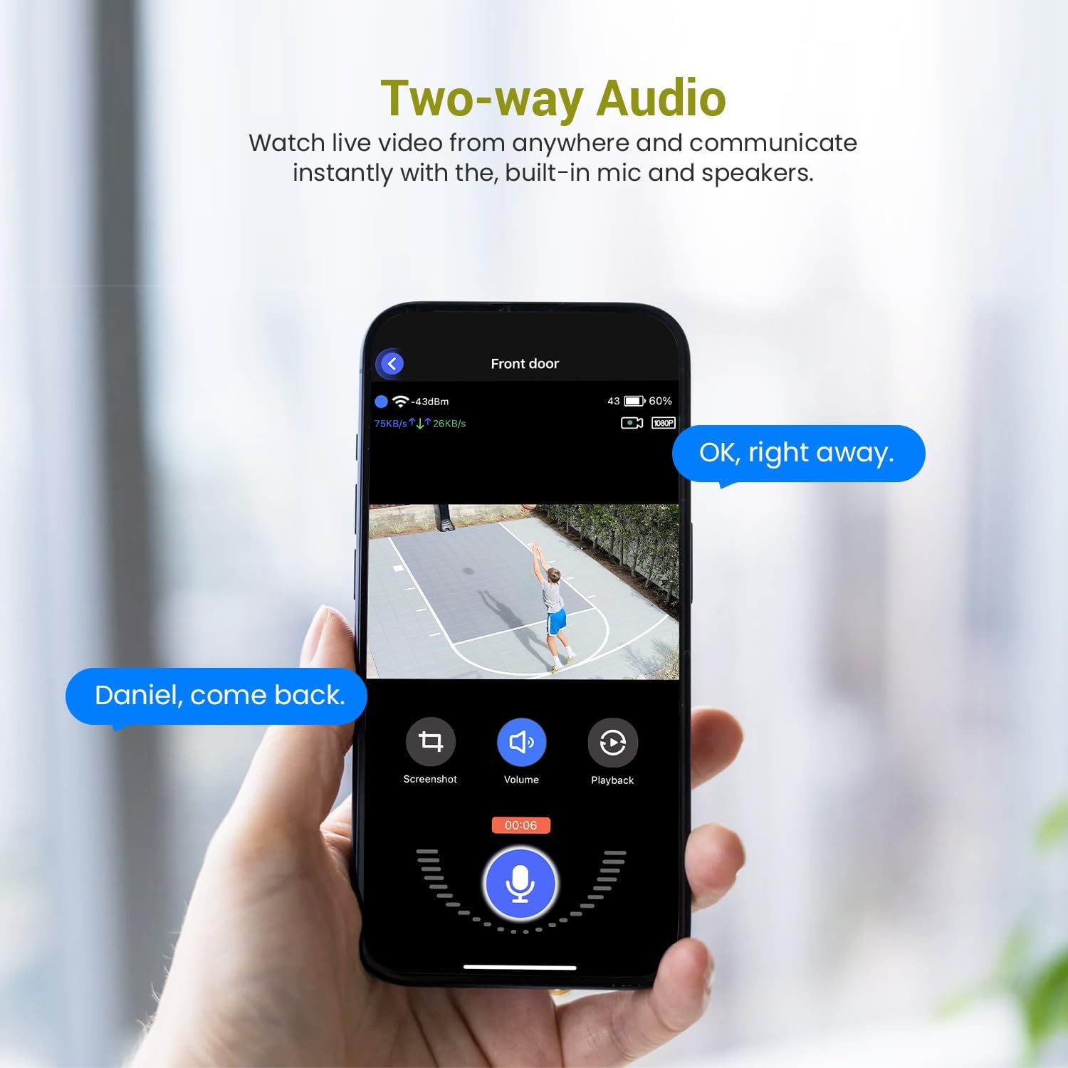 【Two-Way Audio & Multi-User Sharing】Stay connected with loved ones through real-time audio from anywhere. Share access to the camera with family members for simultaneous remote viewing.