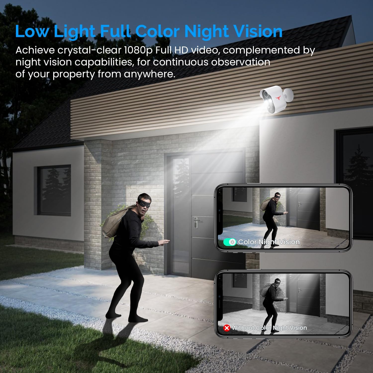 Smart AI Human Detection & Alerts: The built-in PIR motion sensor provides accurate real-time notifications upon motion detection. With AI-powered human detection, receive alerts only when a person is nearby, avoiding unnecessary disturbances from pets or vehicles.Two-Way Audio & Multi-User Sharing: Stay connected with loved ones through real-time audio from anywhere. Share camera access with family members for simultaneous remote viewing.Encrypted Cloud Storage & Weather Resistant: Safeguard your footage with AES-128 encrypted cloud storage. Opt for a subscription plan (sold separately) for enhanced security features, including video saving, reviewing missed events, and sharing videos. This camera is IP65 dustproof and waterproof, ensuring reliable security year-round.1080p HD & Color Night Vision: Experience crystal-clear 1080p Full HD imagery and color night vision, allowing you to monitor your home day and night from any location.Intuitive Motion Alerts: Stay informed with immediate mobile alerts upon detecting movement, ensuring you’re always aware of doorstep events.