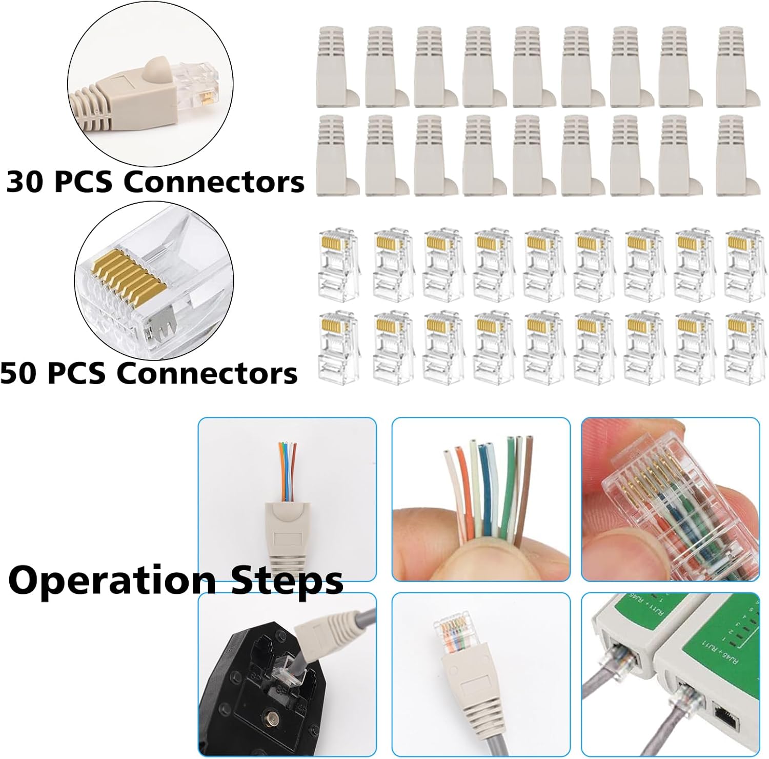 Made of premium material to ensure rapid transmission of signal. Insert the both ends of cables into the crystal connectors respectively.For RJ45 connectors. To protect the connectors from being affected by dust and water, and cause poor contact.