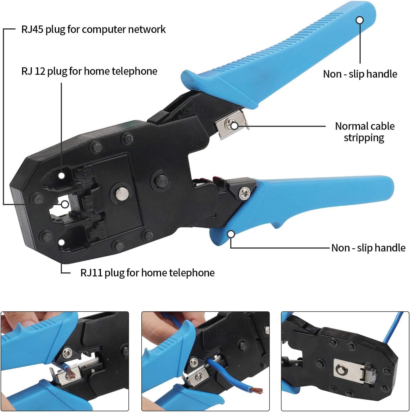 【Durable Safety Material】Network Tool Repair Kit is made of carbon steel, which is corrosion resistant, high hardness and durable. With crimp/cut/stripping tool for RJ-45/11/12 connectors, for Cat5 and Cat5e cables with 8P8C, 6P6C and 4P4C plugs.