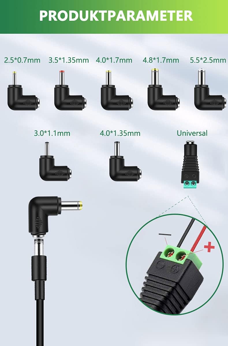 Input: 100-240VOutput: 12V 2000mA maxCable Length: 5FT/1.5MTip 1: 2.5 * 0.7mm; Tip 2: 3.5 * 1.35mm; Tip 3: 4.0 * 1.7mm; Tip 4: 4.8 * 1.7mmTip 5: 3.0 * 1.1mm; Tip 6: 4.0 * 1.35mm; Tip 7: 5.5 * 2.5mm; Tip 8: UniversalOver current protection, Over voltage protection, Over temperature protectionPlease confirm the charger parameters before buying, whether the model is the same as our product description