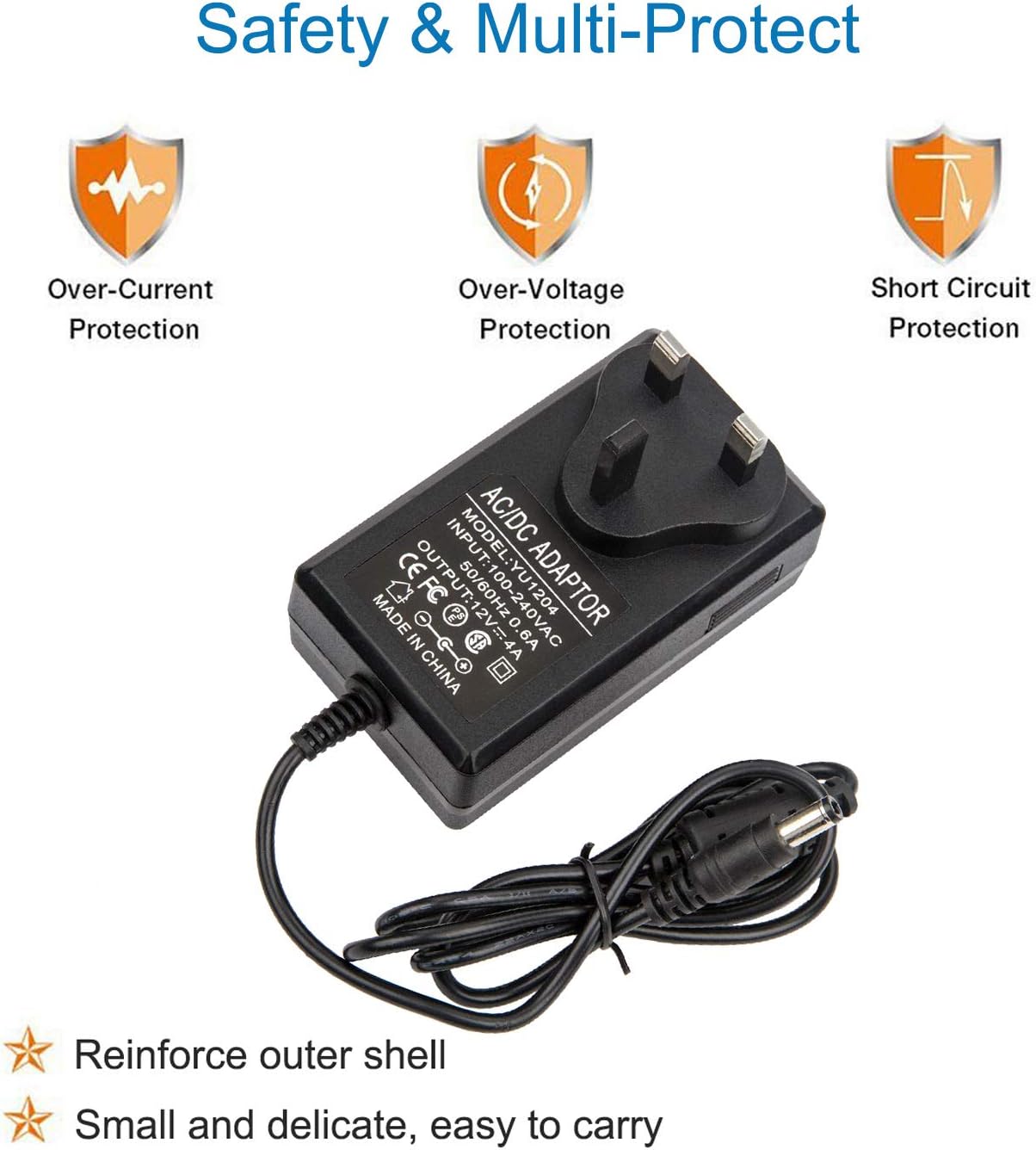 It is perfect for 5050 3528 12V LED Strip Light, Wireless Router, ADSL Cats, HUB, Security Cameras, LED Driver, CCTV Security System, LCD Monitor, Webcam Router and other 12V devices less than 48W.