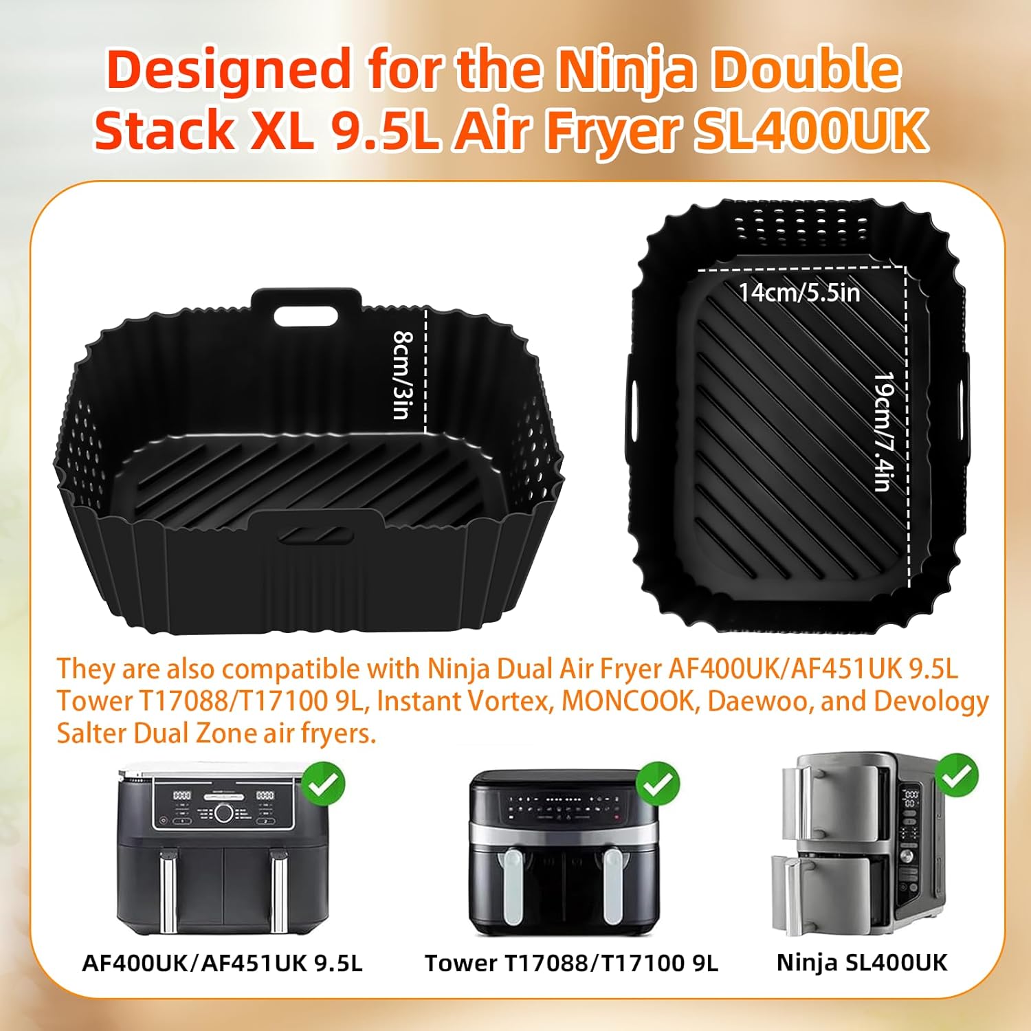 【Versatile and Compatible with】These air fryer silicone liners are designed for various cooking applications such as microwave ovens, barbecues, steamers, air fryers, and baking. They are also compatible with Ninja Dual Air Fryer AF400UK/AF451UK 9.5L, Tower T17088/T17100 9L, Instant Vortex, MONCOOK, Daewoo, Devology Salter Dual Zone air fryers,etc. Tips: Please measure your air fryer before purchasing.