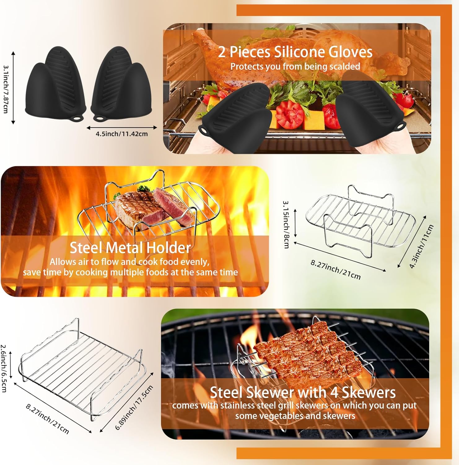 【13 Piece Air Fryer Accessories】- Air Fryer Accessories includes 2* silicone air fryer liners, 1*stainless steel steam grill, 1*stainless steel grill rack, 4*stainless steel skewer, 1*oil brush, 1*Anti-scalding clip, 2*silicone gloves and 1*silicone Spatula. Save your time and effort to make kebabs, steak, veggies, potatoes, pizza, grill pies and more.