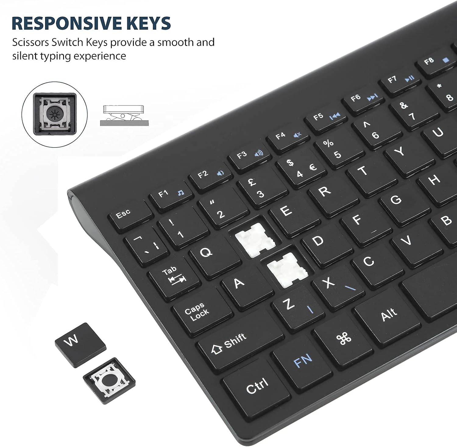 FULL SIZE & ULTRA-THIN KEYBOARD : 17.72×5.91×1.57in with 101 Keys,ultra-thin enough to put it into your handbag or suitcase. Scissor-key-switch provide smooth typing and sensitive response, lowest volume keyboard keys and quiet mouse button.
