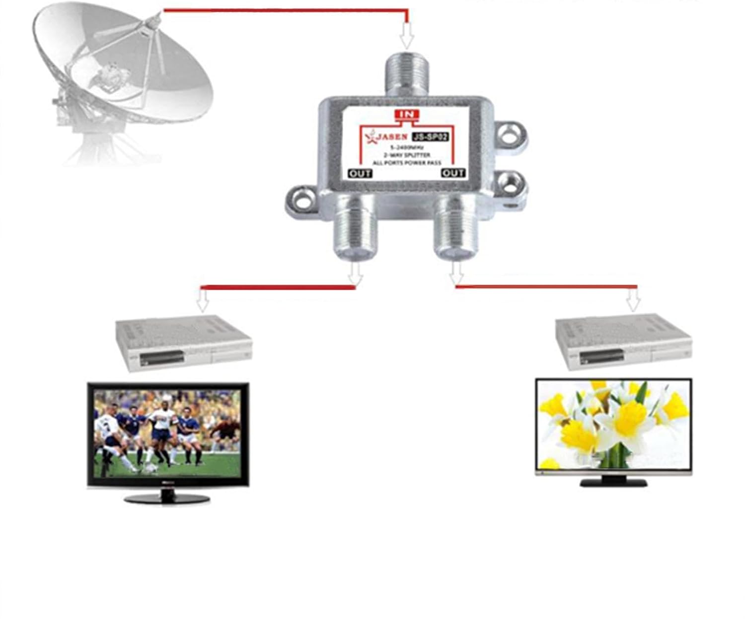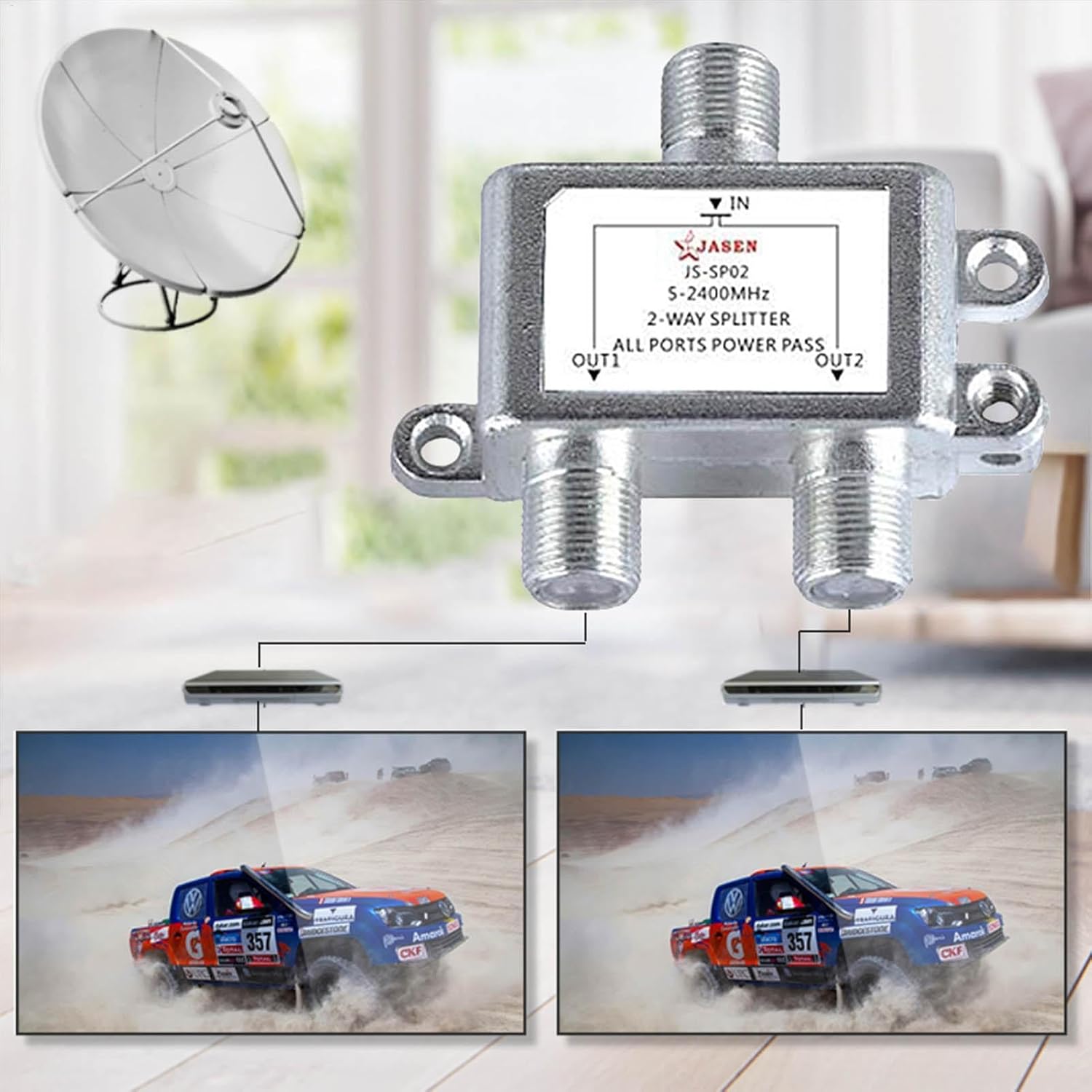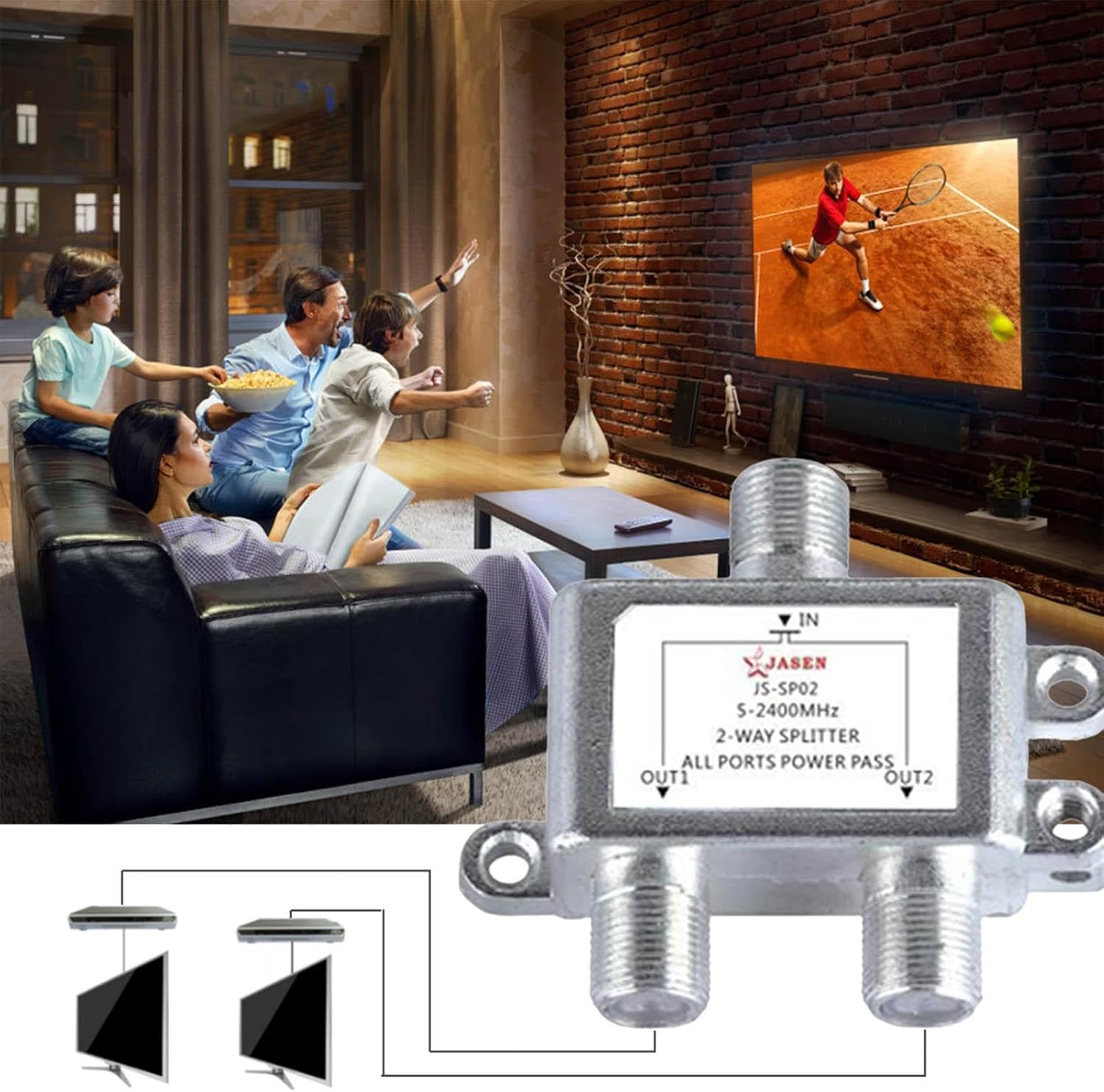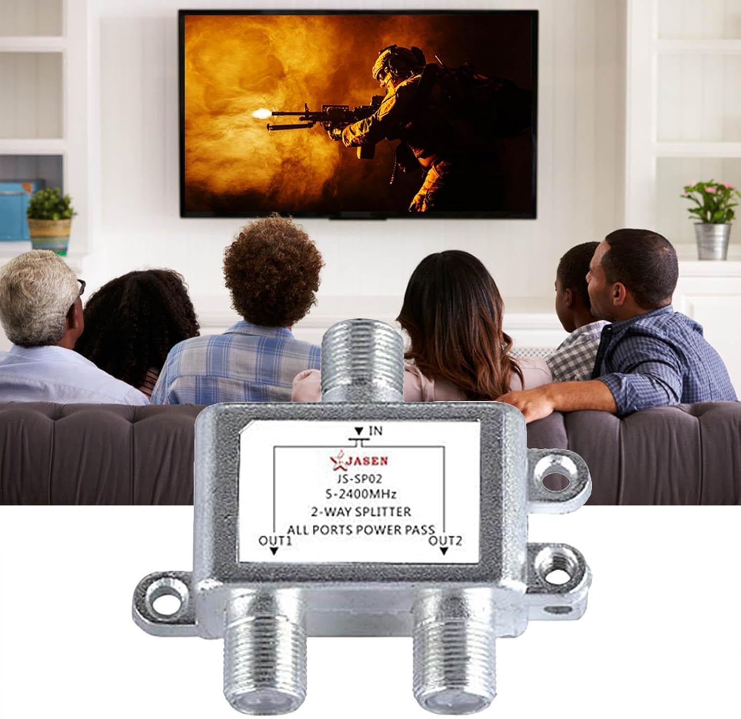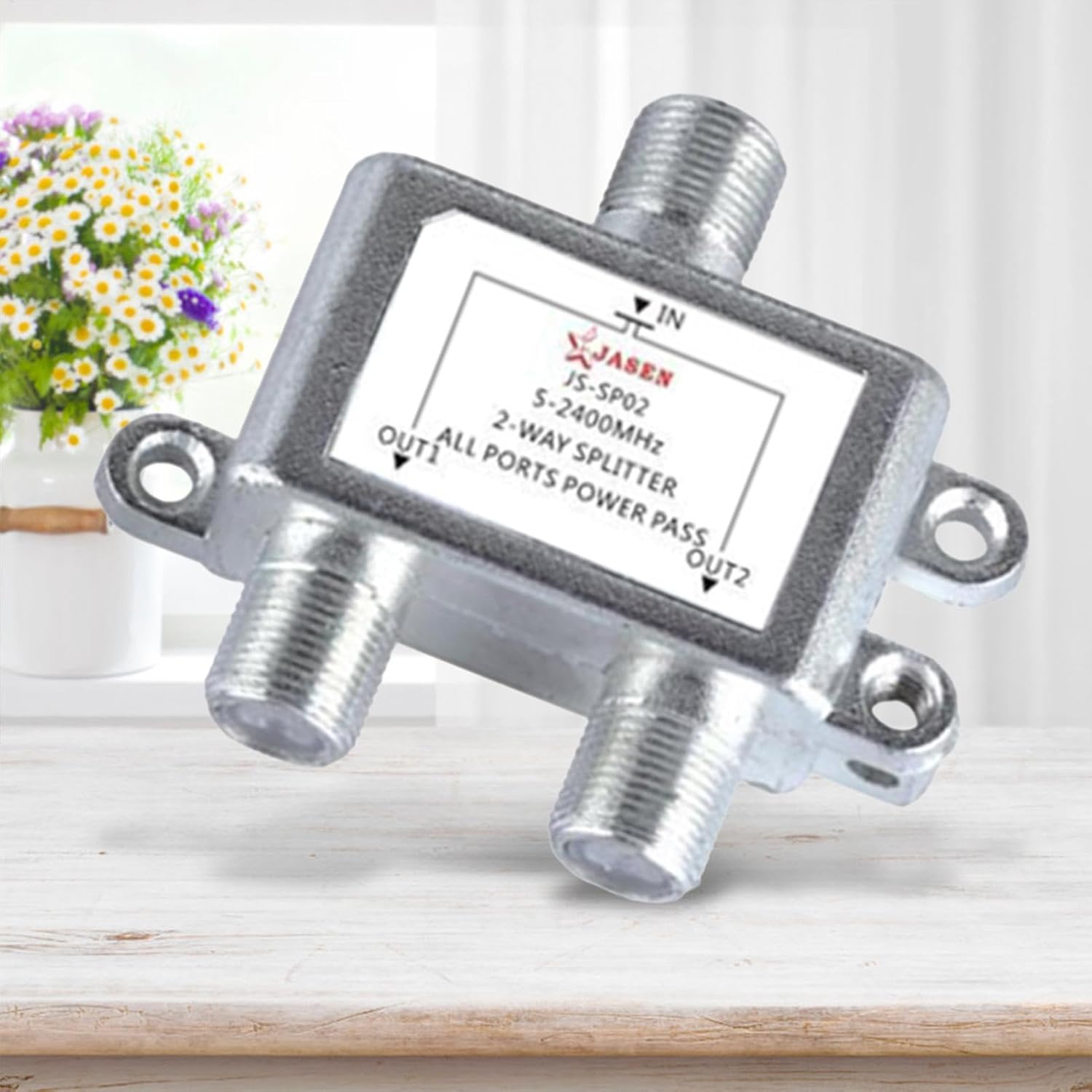 【2-Way Coax Cable Splitter】Coaxial Cable Splitter is used for splitting a single digital signal to up to 2 devices. It works with cable TV, satellite, high speed internet or camera, and cable TV, amplifying antenna, amplifier, and other coaxial devices.
