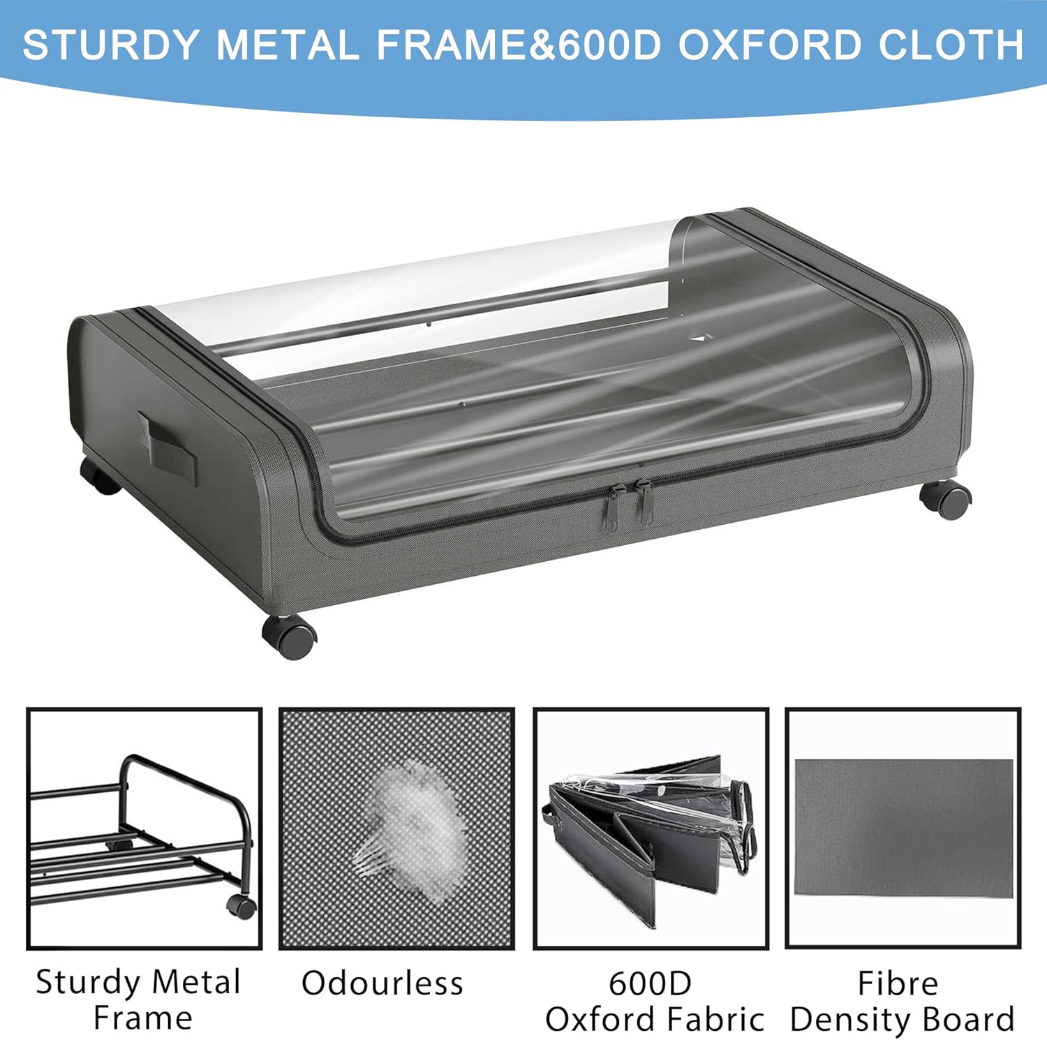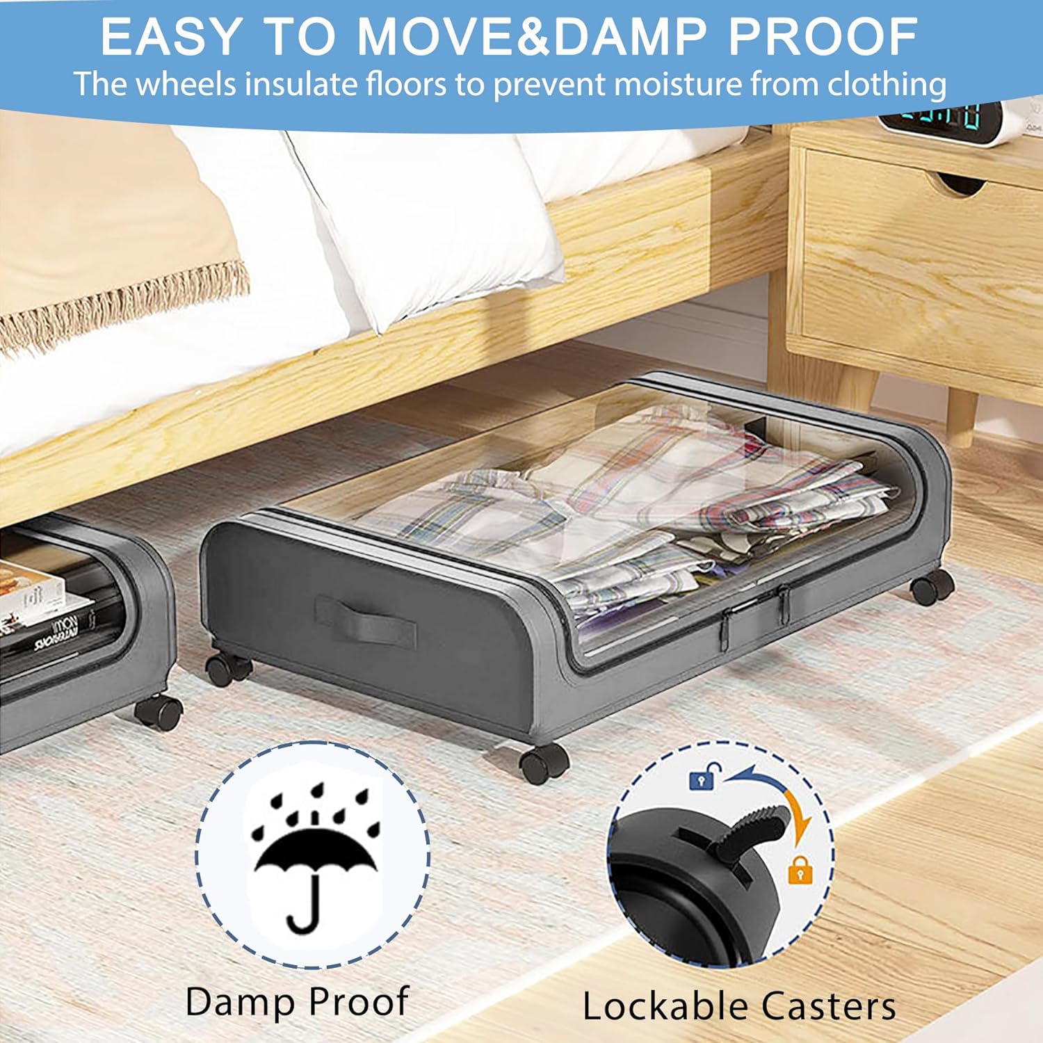 2 Pack Under Bed Storage with Wheels Lid 48L Rolling Metal Frame Underbed Containers Clear Window Storage Bag Box Organization Home Bedroom Organizer Drawer Bin for Clothes Shoes Toys Blankets Grey