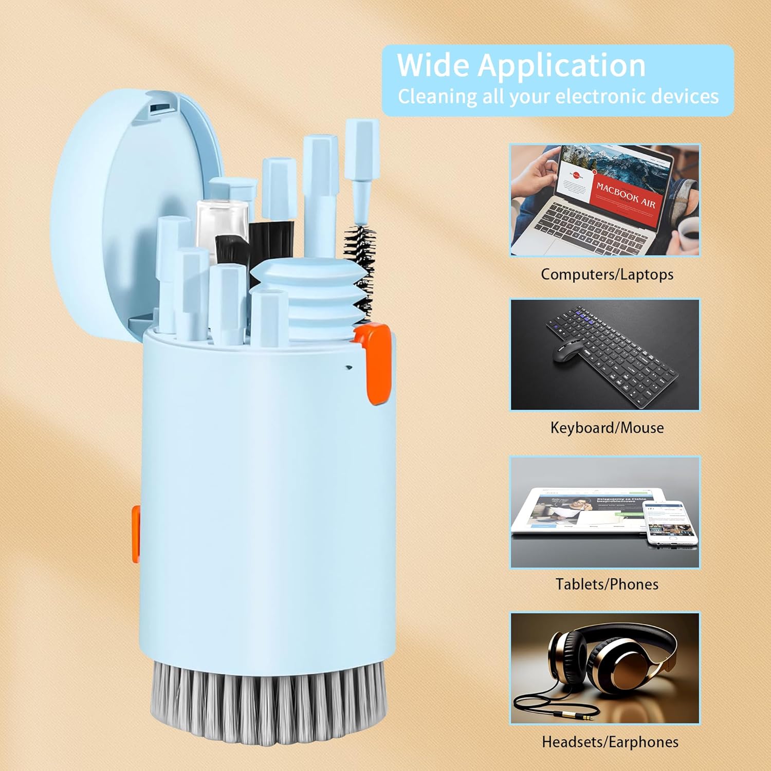 【Multi-Function】Our Airpod cleaning kit is suitable for a variety of electronic devices, including laptops, PCs, headphones, gaming keyboards, speakers, camera lenses, monitors, smartphones, TVs, and touch screens.
