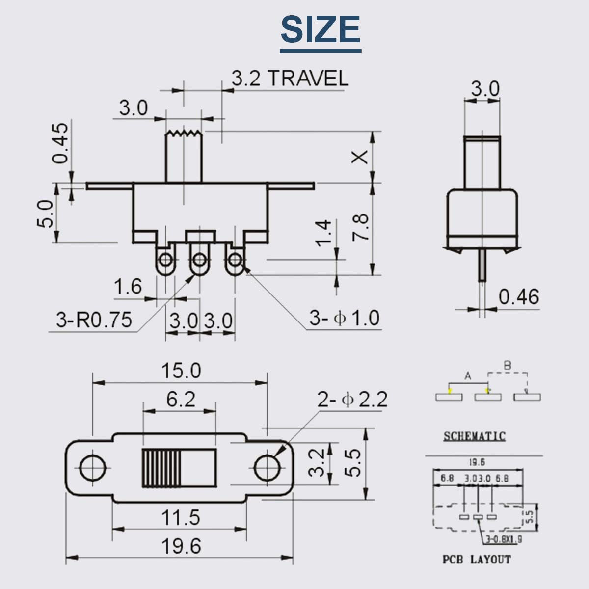 Switch Size: 12.7 X 6.6 X 13.2mm / 0.5 X 0.26 X 0.52inch (LxWxH)