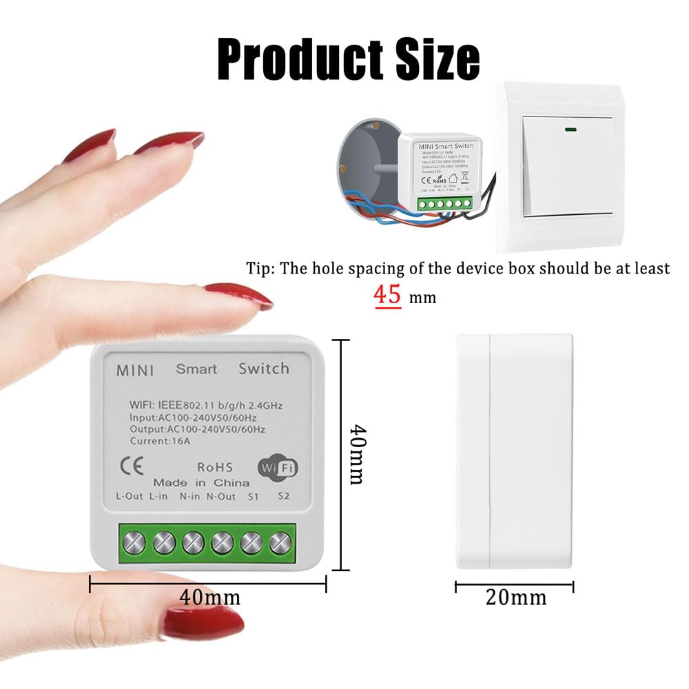【Specification】 4 x 4 x 2 cm, 16 Amp Max, 2.4GHz,Neutral conductor is required, AC 100–240 V.50/60H maximum 16A. This Smart Relay Module is also suitable for power outlets. This converts a conventional lamp switch into a smart home light switch without compromising the original decoration style.
