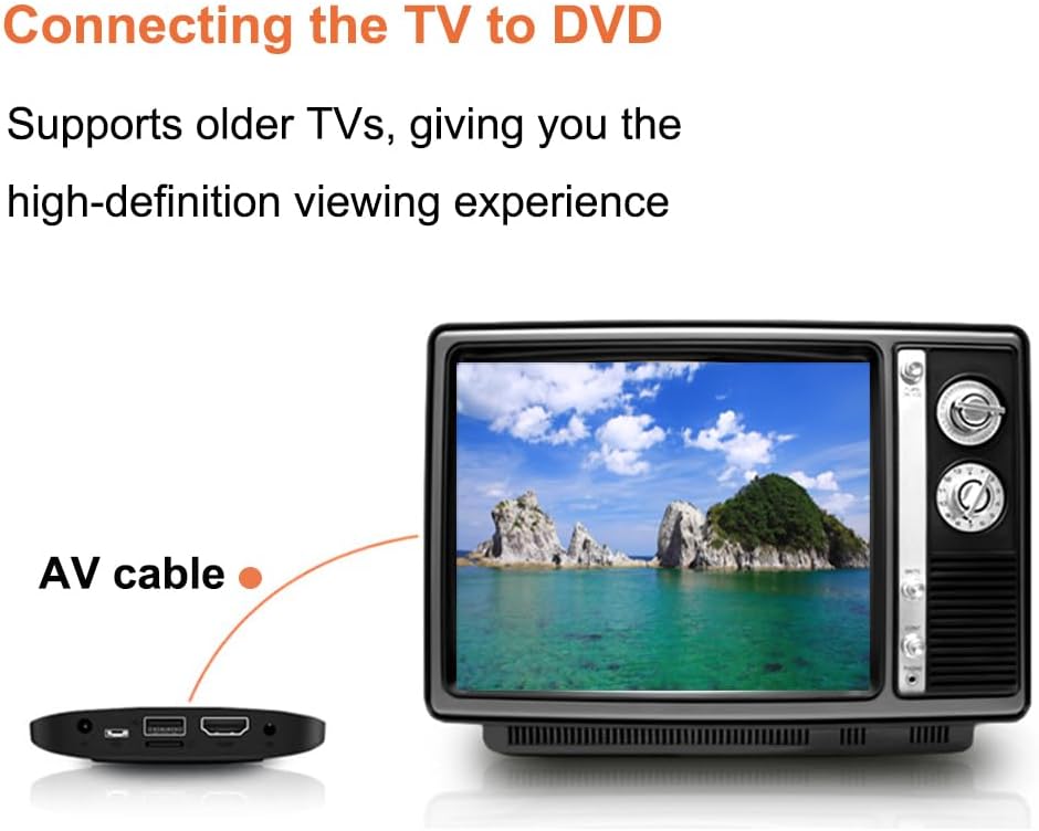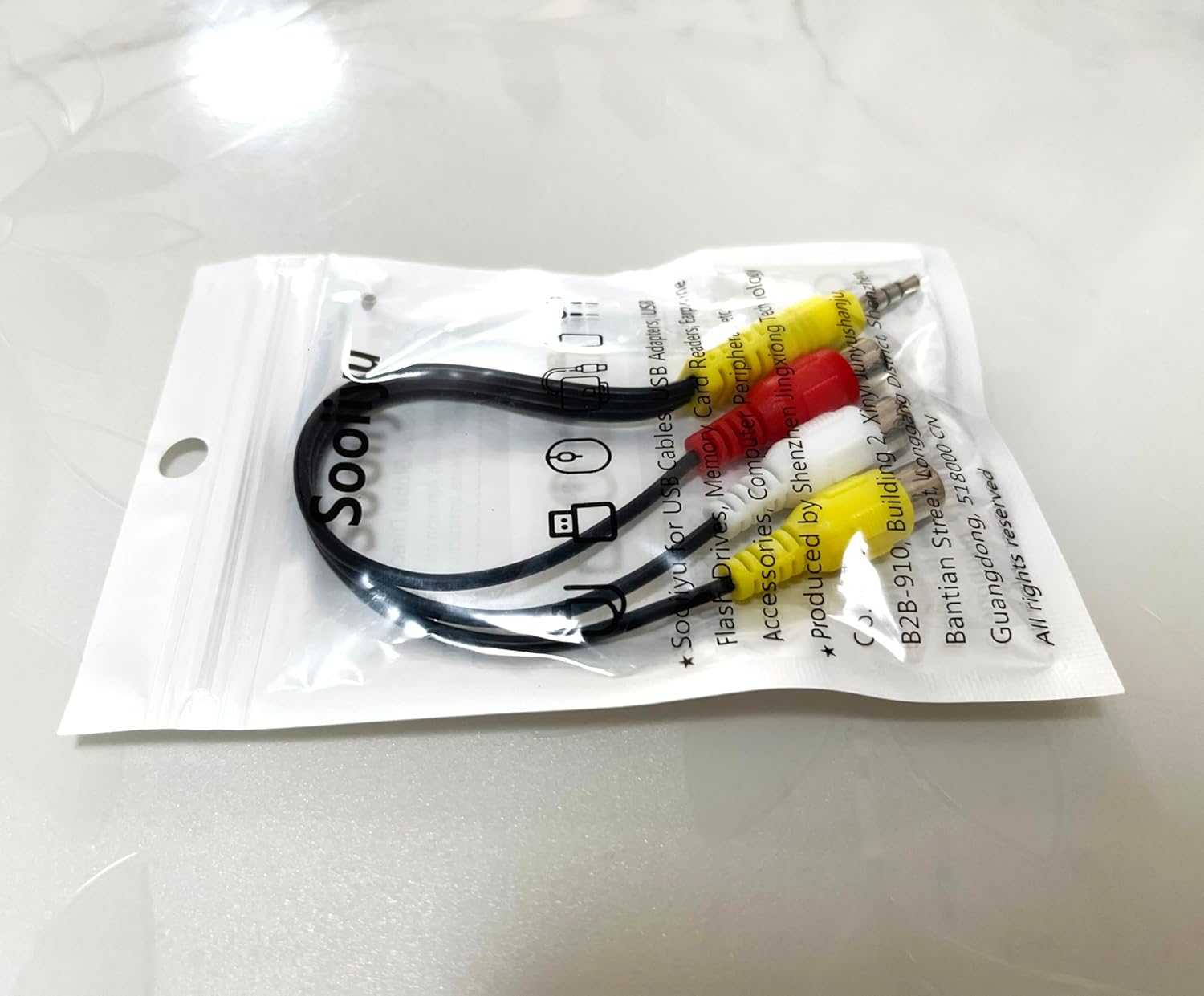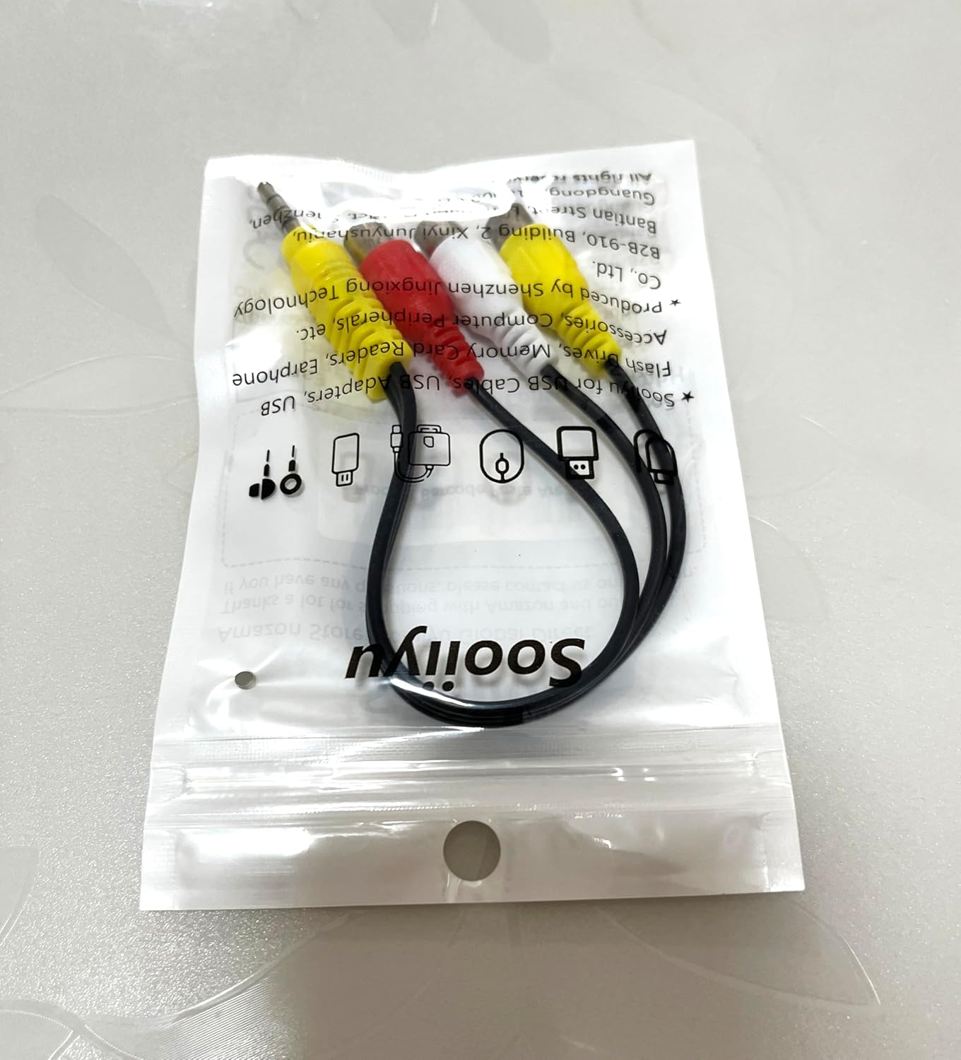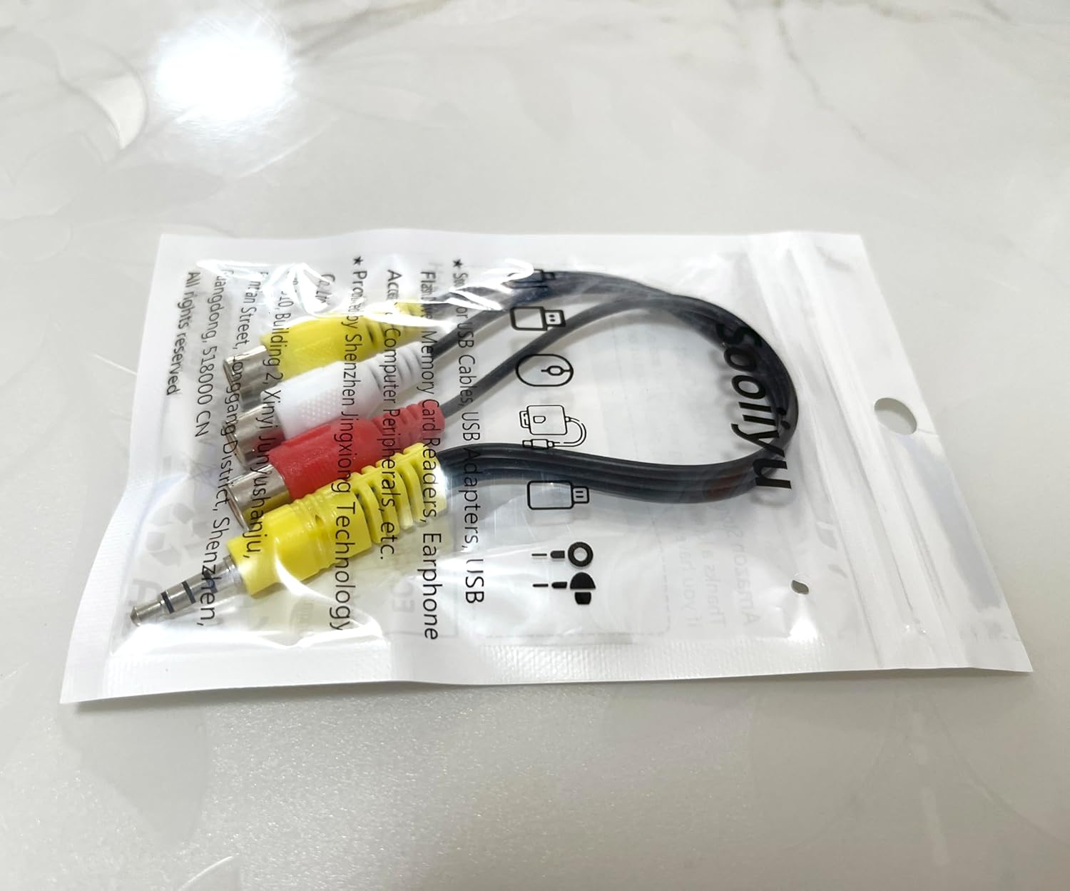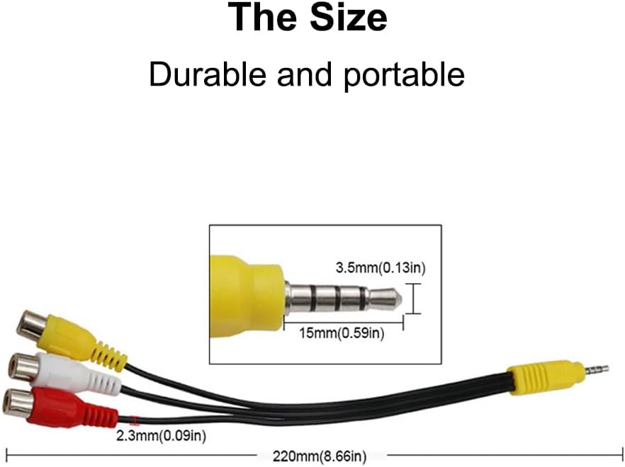 The AV Conversion Cable have a 3.5mm Audio/Video Plug and AV plugs, video (yellow), right audio (red) and left audio (white). Length: 22cm/8.6 inches, compact and portable.