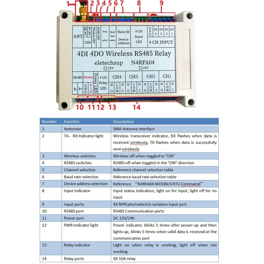 4 Channel 4DI-DO 433M RS485 Relay Module,Wireless 4CH RS485 Bus Relay Module RF Master-Slave Networking Remote IO Swicth Board for PLC Industrial Equipment (24V)