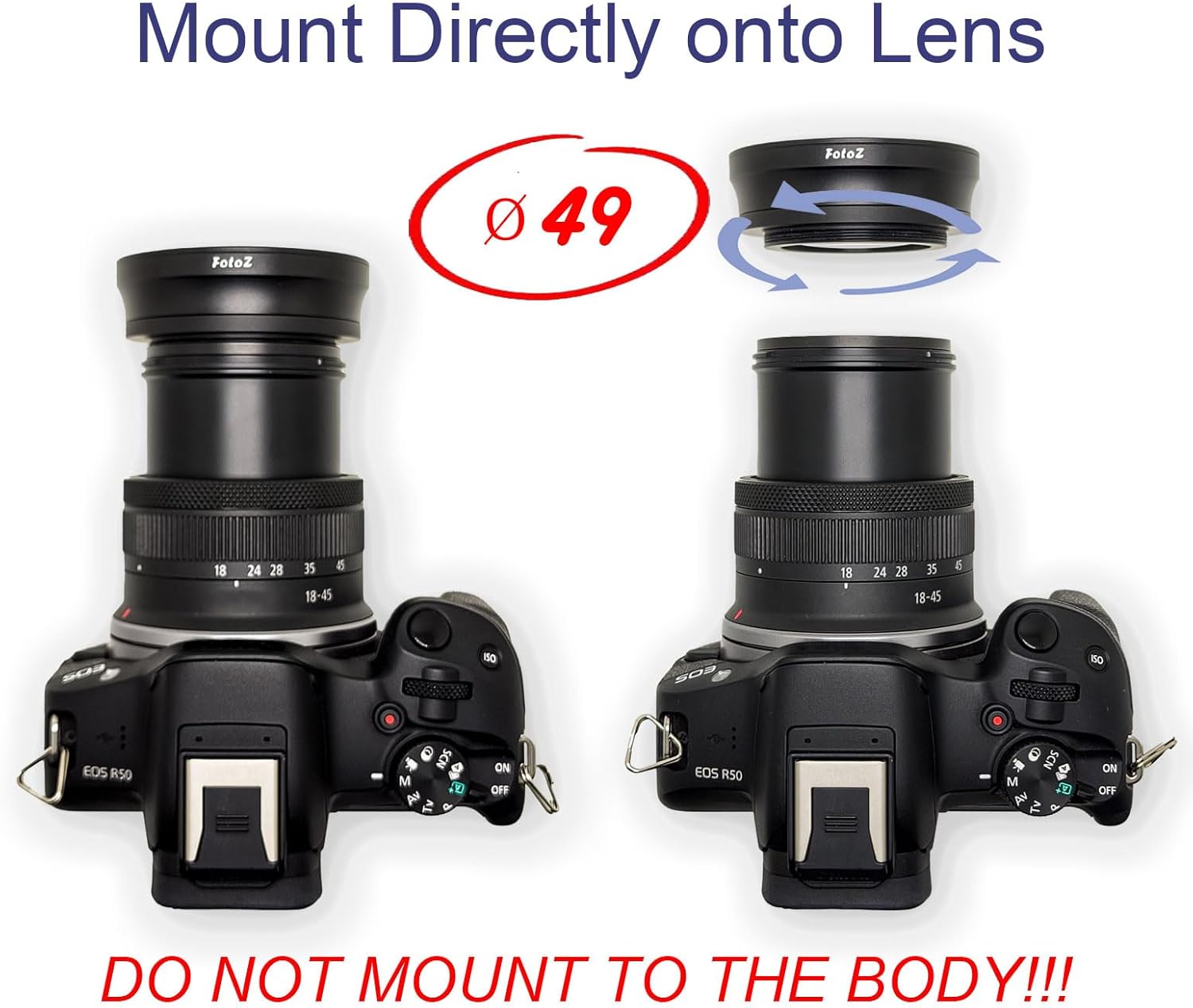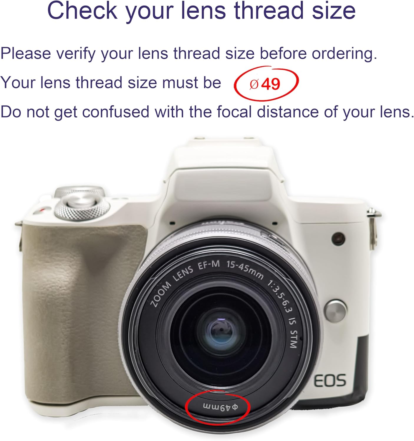 This HD Wide & Macro Conversion lens attaches to camera lens with a 49mm filter thread, suitable for Canon EOS R50 R100 M M2 M3 M5 M6 Mark II M10 M100 M200.