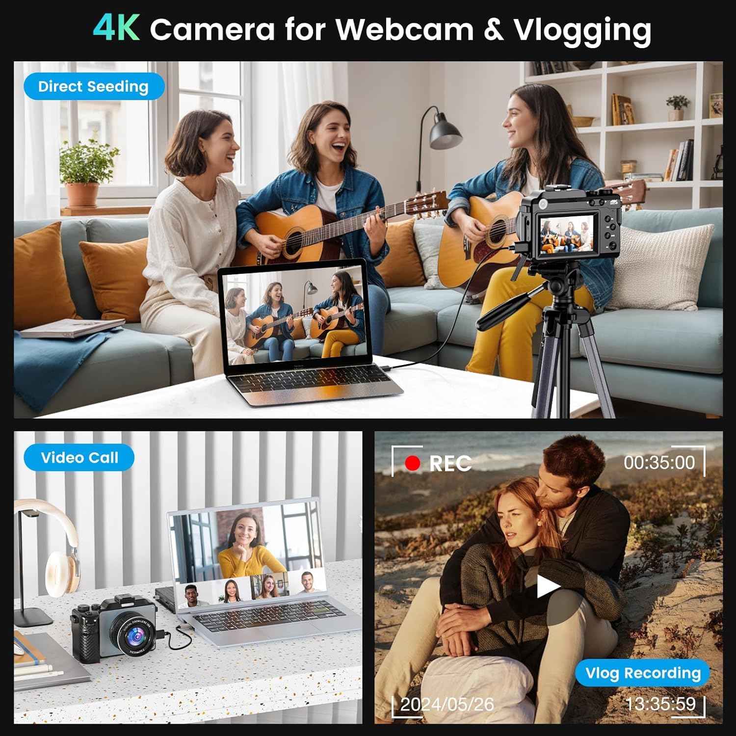 【Webcam Function & WiFi Transfer & Pause Function】This YouTube camera can be used as a Webcam, please insert the USB cable and switch the camera to “Webcam” mode, perfect for video calling, live streaming, blogging, vlogging, online teaching, etc. This 4k digital camera also has WiFi output. The pause function allows you to pause and then continue to record when recording.