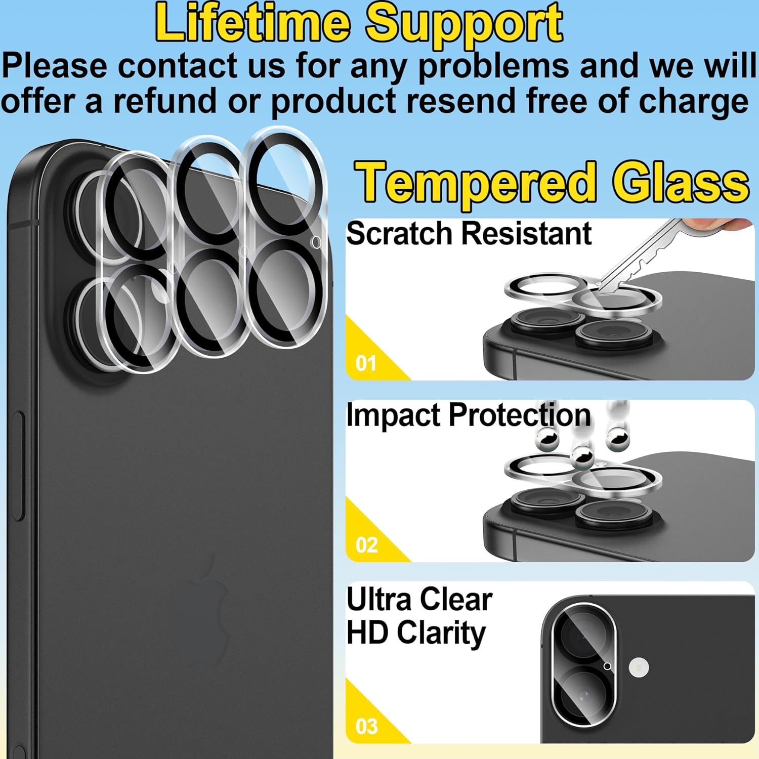 [Impact Protection & Scratch Protection]: -9H hardness tempered glass camera Lens Protector are impossible to scratch and will help to protect your iPhone 16 & iPhone 16 Plus camera lens from breaking & scratch.