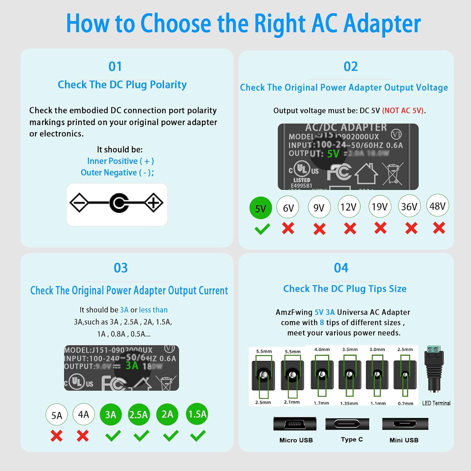1. Please find the spec label of your device and check the working voltage. It should be 5V DC, not be AC 5V or lower/higher than 5V DC. Otherwise, your device will not work or be damaged.2. Check the max current your device will draw. It should be equal to or less than 3A, such as 2.5A, 2.0A, 1.5A, 1.0A. Otherwise, your device won’t work well and the power supply will be damaged very soon.3. Check the power input port of your device. Its outer diameter should be 5.5mm; inner core diameter should be 2.5mm or 2.1mm. Inner core polarity should be”+”, exterior polarity should be” – “.4. If you have a power supply for reference, their output voltage, plug size, polarity should be the same .If our current is equal to or higher than original one’s, then our will work with your device.5. If you purchase the adapter charger and find that you cannot charge the battery, it may be that your battery’s life has expired or is damaged.