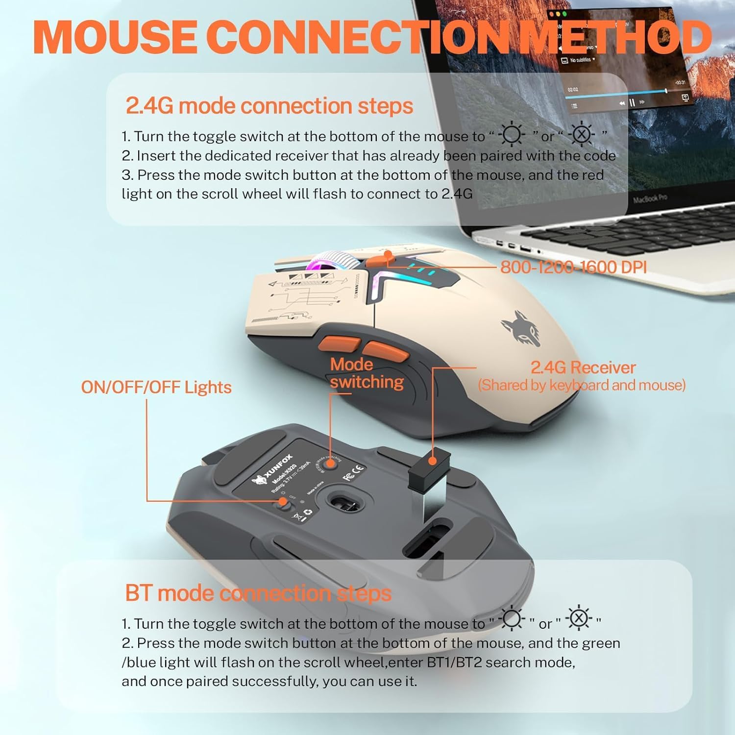 【Wireless Gaming Mouse】: The mouse uses high-precision optical sensor, sensitivity is 3600DPI (user adjustable 1200/1800/2400/3600 DPI), 4000fps scan rate, 125Hz tour detection rate, can withstand 10G acceleration, can meet your fast browsing and game requirements.