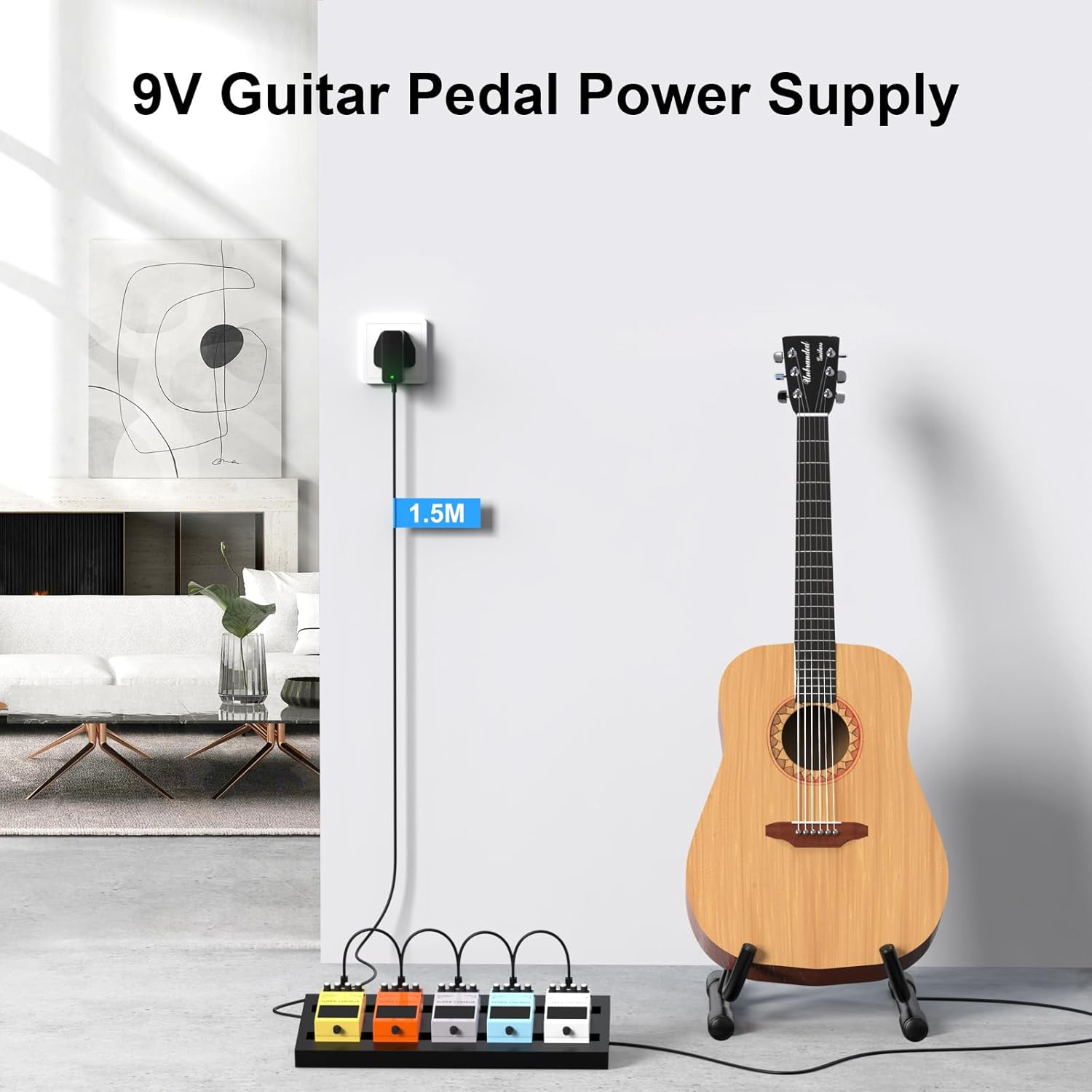 9V Guitar Pedal Power Supply DC 5 Way Daisy Chain Charger for Behringer, JOYO, Donner, BOSS, Sonicake, MXR, TC Electroneic, Zoom Effects Pedals Adapter Tip Negative 1.5m Cable (UKCA/Light)