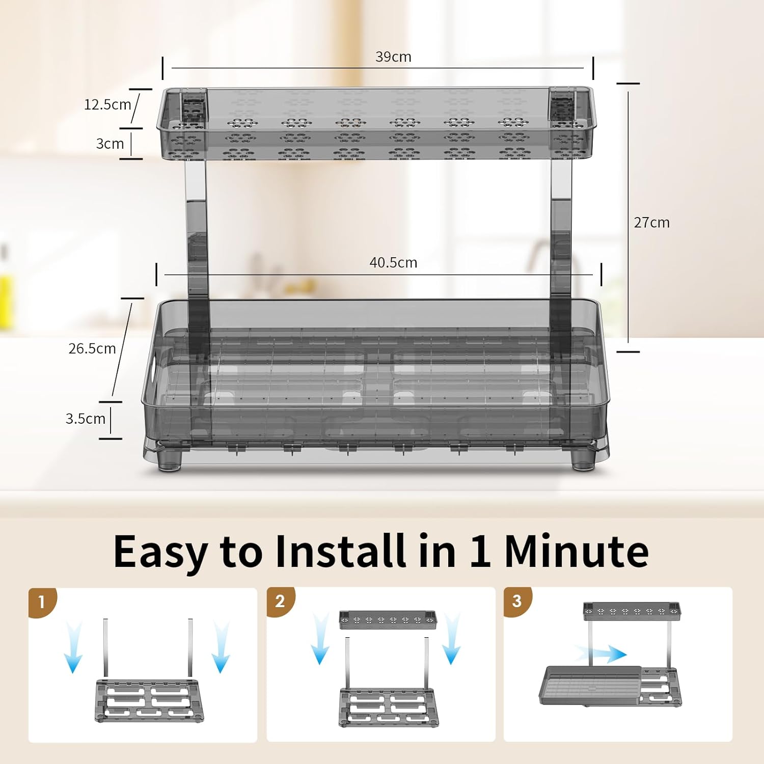 Easy Assembling: The cupboard storage organiser comes with installation instructions and it is easily assembled within a minute without any extra tools required. Note: the size of this kitchen sink storage rack is 40.5 cm (L) x 26.5 cm (W) x 27 cm (H). Please measure your cabinet size before purchase