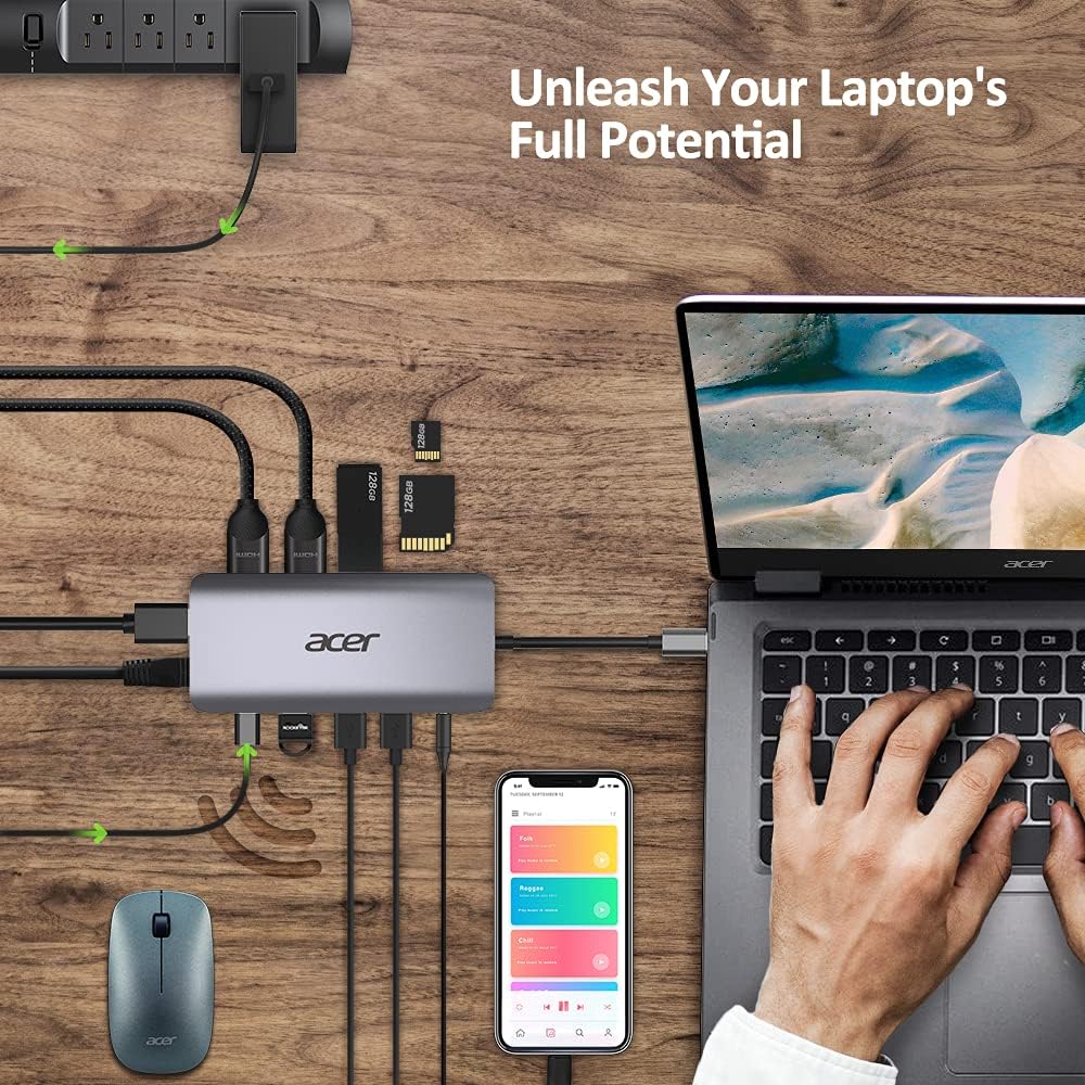 Acer 12in1 Type C dongle: 2 x USB3.2, 2 x USB2.0, 1x SD/TF, 2 x HDMI, 1 x PD, 1 x DP, 1 x RJ45, 1 x 3.5 Audio