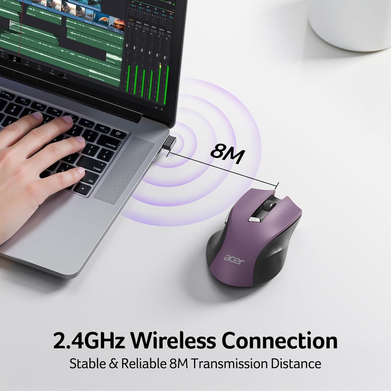 acer Wireless Mouse, 3 Adjustable DPI Ergonomic Computer Mouse 2.4GHz USB Receiver, 6 Button, Cordless Optical Tracking, Battery Indicator, Portable Mice Wireless for Laptop, PC, MacBook Pro (Purple)