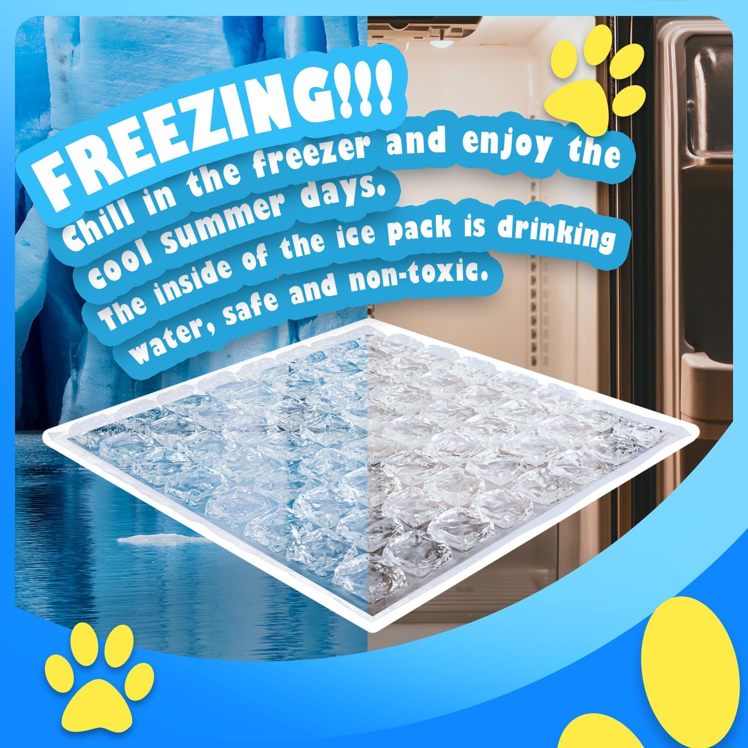 Natural cooling. Contains only pure water, no harmful chemicals or gels Triple layer cooling technique: combines a soft cushion, a ice cube sheet and a thick layer of insulation to create a long-lasting cooling solution With snaps on three sides to connect multiple mats for larger dogs Made with rip-stop materials for indoor or outdoor use