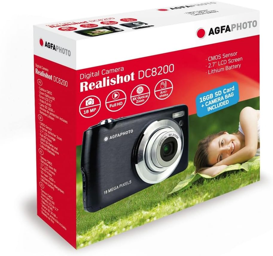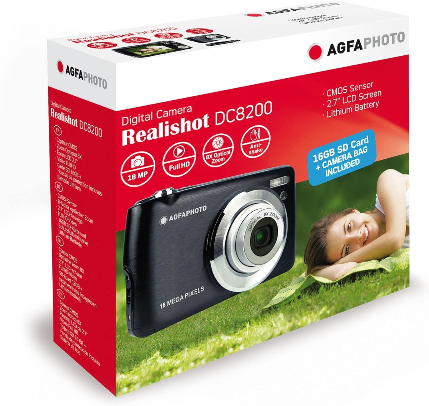 AGFA PHOTO Realishot DC8200 – Compact Digital Camera, 18MP, Full HD Video, 2.7” LCD Screen, 8X Optical Zoom, Lithium Battery and 16GB SD Card – Black