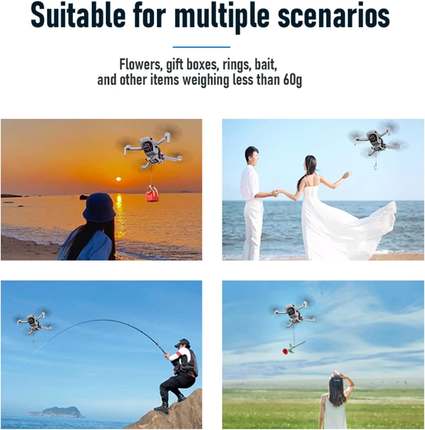 【Easy to Assemble】 The strap is fixed on the device, and the device is aligned with the bottom hole of the drone and fixed. The strap goes around the top of the drone and goes through the device hole, then it is tightened and fixed. Suitable for multiple scenarios, like proposal, fishing, birthday surprise, etc.