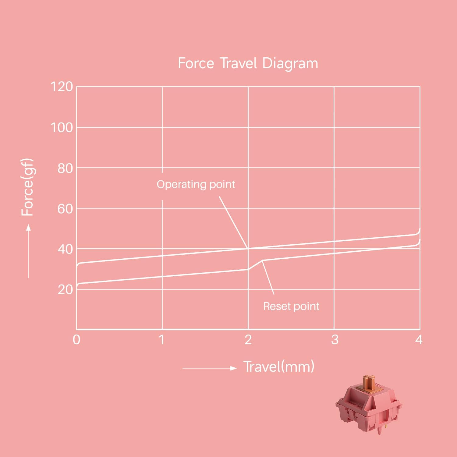 Parameter Two pink, square-shaped mechanical switch components. Specifications listed include linear type, 40ยฑ5g operating force, and 4.0mm total travel.Two pink, square-shaped mechanical switch components. Specifications listed include linear type, 40ยฑ5g operating force, and 4.0mm total travel. Pink technical force travel diagram showing operating point and reset point plotted on grid with force and travel measurements.Pink technical force travel diagram showing operating point and reset point plotted on grid with force and travel measurements.