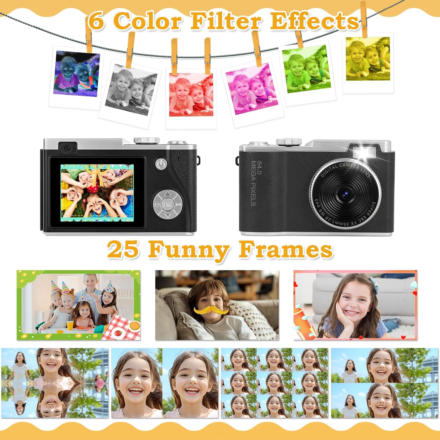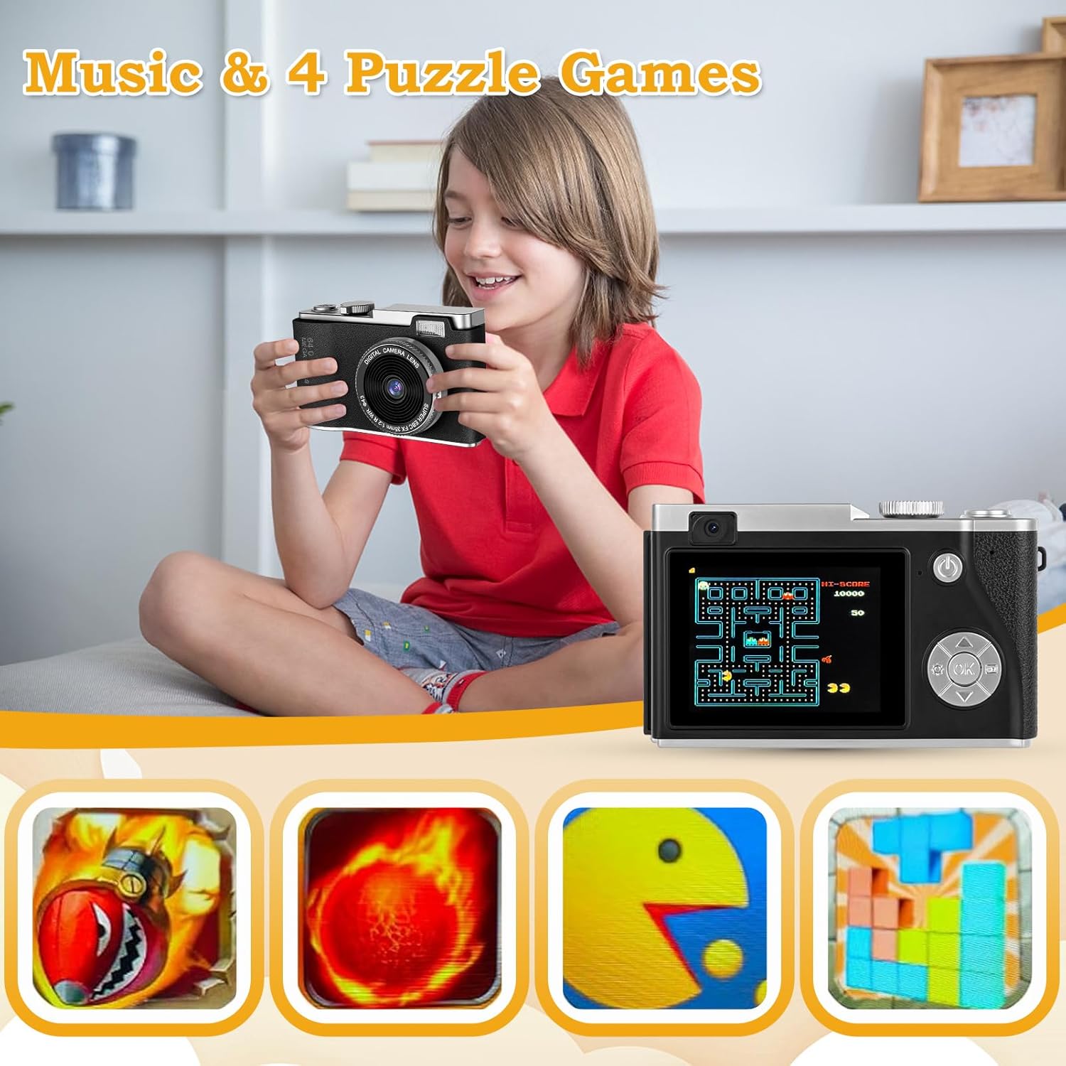 【MULTIFUNCTIONAL CHILDREN’S CAMERA】This children’s camera is built with many functions, including photo capture, video recording, self-timer, and time-lapse shooting, helping kids experience different aspects of photography. It comes with 25 cartoon funny frames, 6 color filters, and 6 mirror effects, allowing your children to DIY their photos. Additionally, it features 4 puzzle games that bring more fun and contribute to children’s intelligence development.