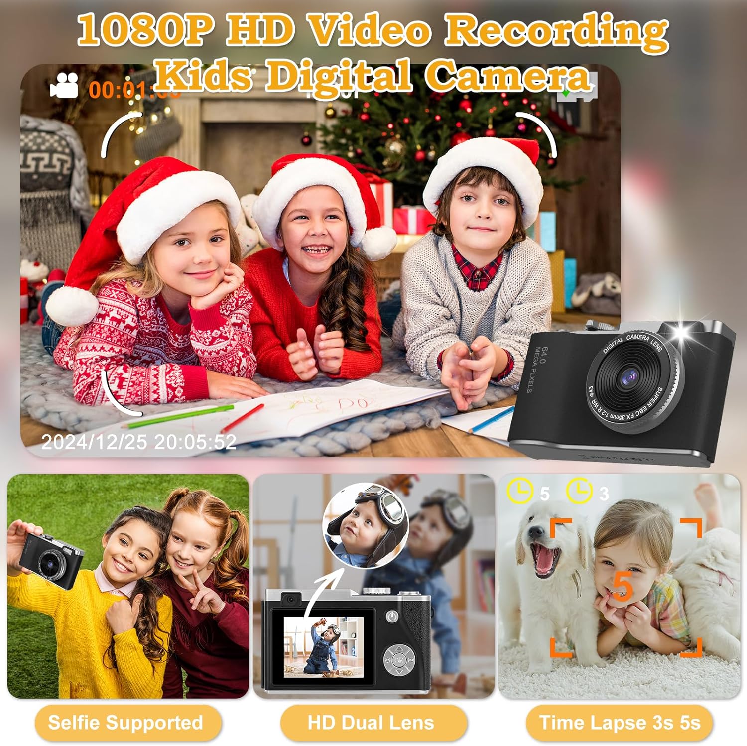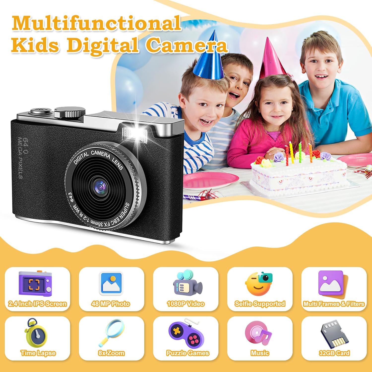 I got this camera for my 5-year-old, and itâs been brilliant. The retro design is adorable, and itâs just the right size for little hands. My child loves the fun cartoon frames and filters, and the dual lenses mean they can easily take selfies. The picture quality is surprisingly good for a kids’ camera, and the 32GB memory card is a real bonus. It charges quickly and lasts long enough for a day of snapping pictures. The lanyard makes it easy for them to carry, and they enjoy the little games too!