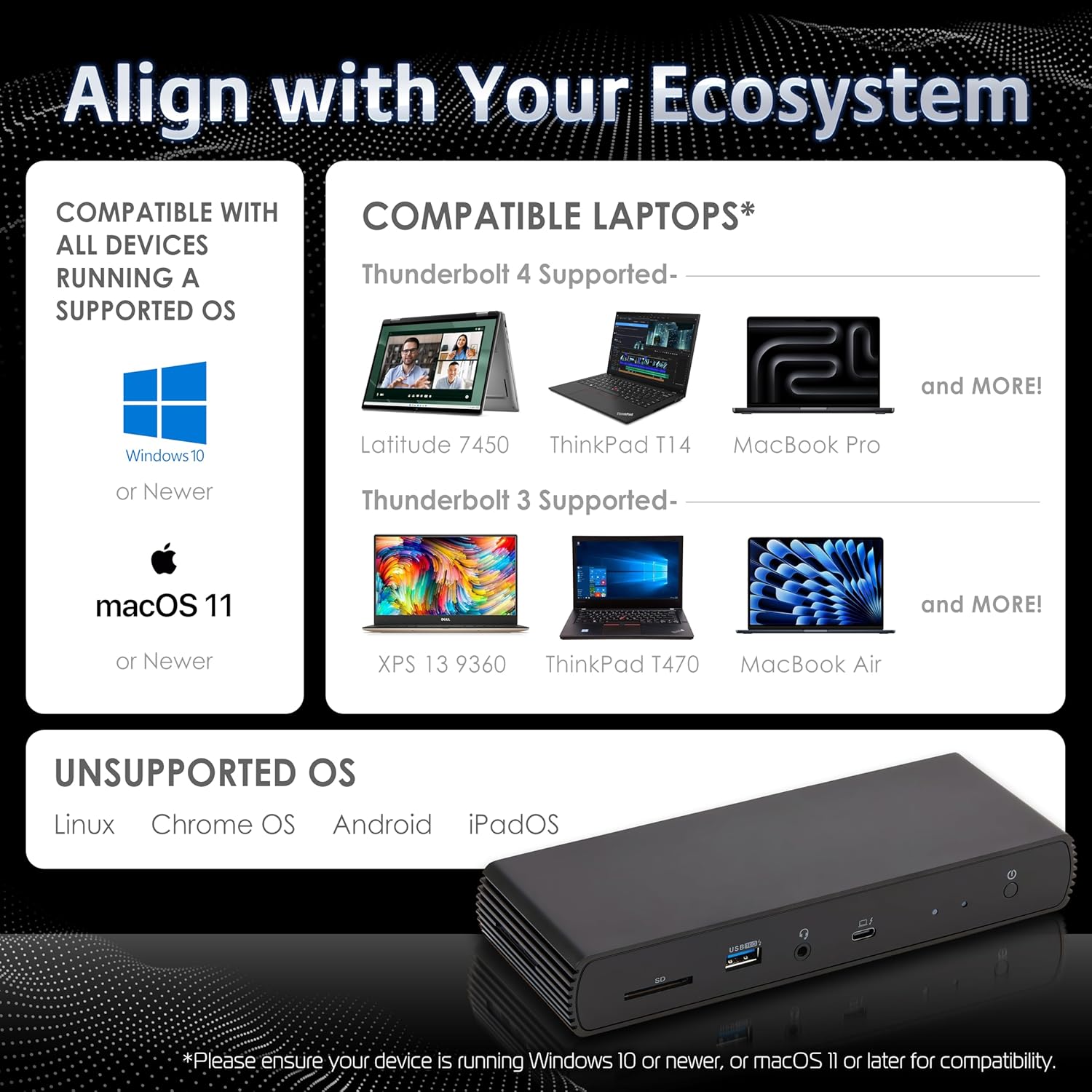 Compatible with Laptops running Windows 10 OS or later which have a Thunderbolt 4 port, and non-M1/M2 chip MacBooks running macOS 11 (Big Sur) or later. Backwards compatible for Thunderbolt 3 laptops work with limited functionality (e.g. not support dual display). Not compatible with Linux or Chrome OS laptops, and M1/M2 chip MacBooks running maxOS 10.16 or earlier.