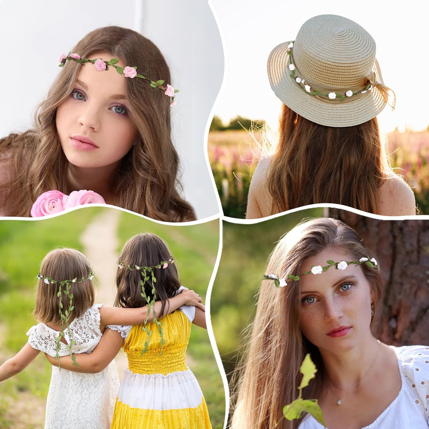 Andibro Flowers Crown Floral Garland,2pcs Headband Rose Flower Wreath Handmade Bohemian Style Headdress for Fun Day Out Bridal Headwear Party Festivals Hair Accessories (White+Pink)