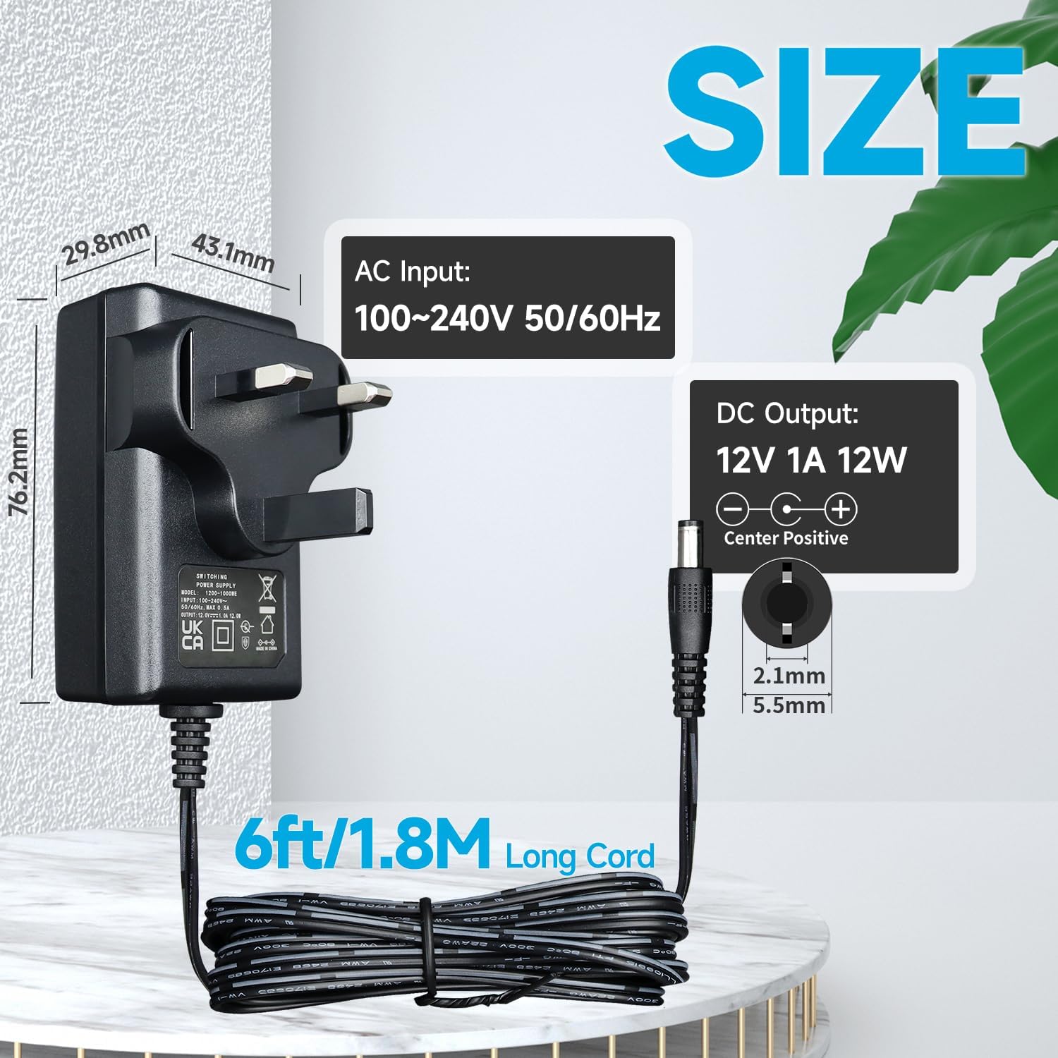 [AC to DC 12V 1A] —AC Input: 100V-240V 60Hz/50Hz ; DC Output: 12V 1A 12W. Cord Length: 1.8M (6Ft). Plug Size: 5.5mm*2.1mm(Can be expanded to 3.5*1.35mm, 4.0*1.7mm, 5.5*2.5mm). DC Polarity: Center Positive, Outer Negative. Widely Used for Home, Office, Travel, etc.