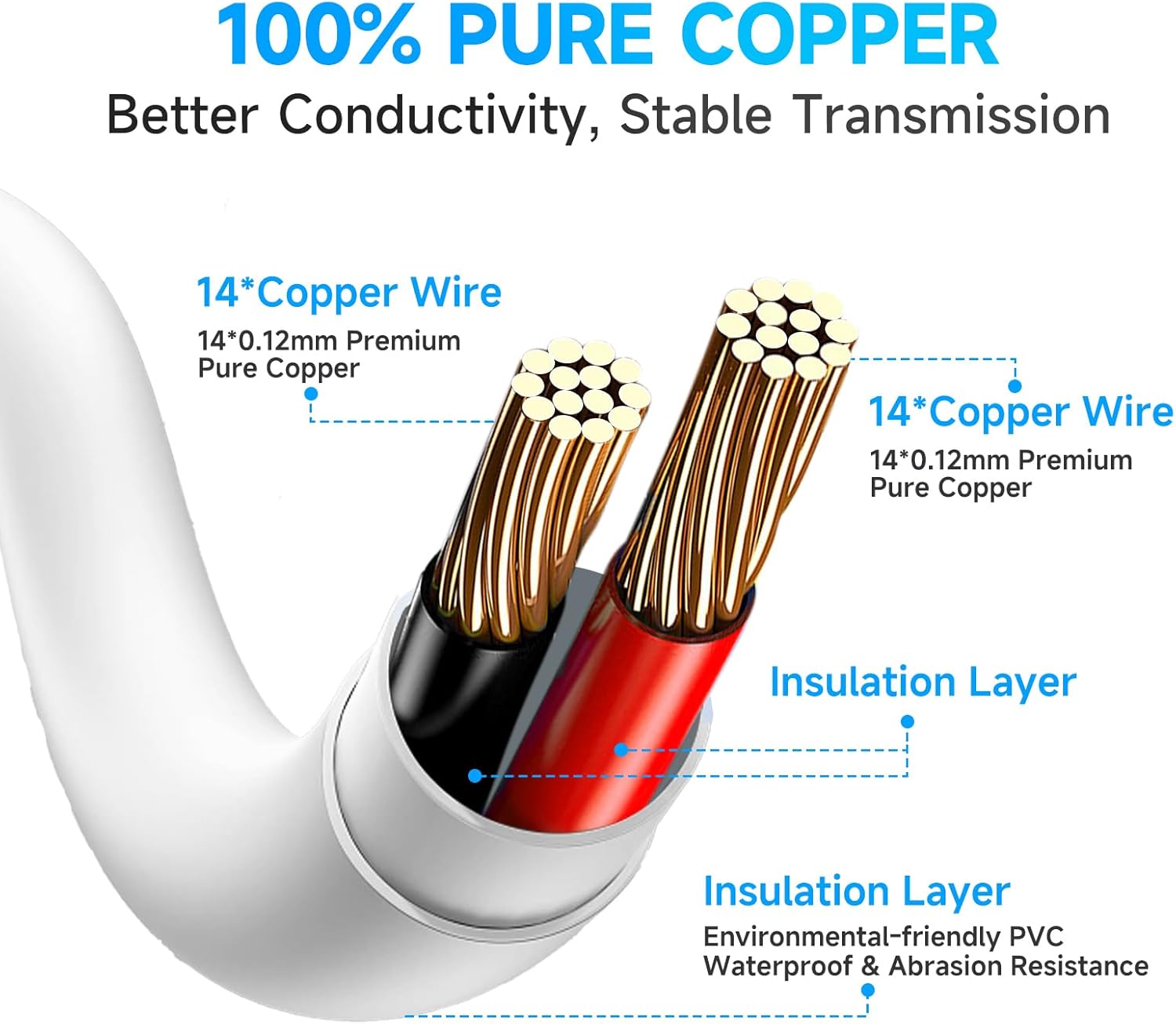 [Safe & Reliable]—Made of 100% Premium Pure Copper Wire, the cable works safer with better conductivity and more stable transmission than those cables with aluminium-clad copper wire. With premium pure copper, solid connector and high-quality insulation layer, the cable makes sure a safe, stable and reliable connection, and protects you and your devices when offering continuous power supply.