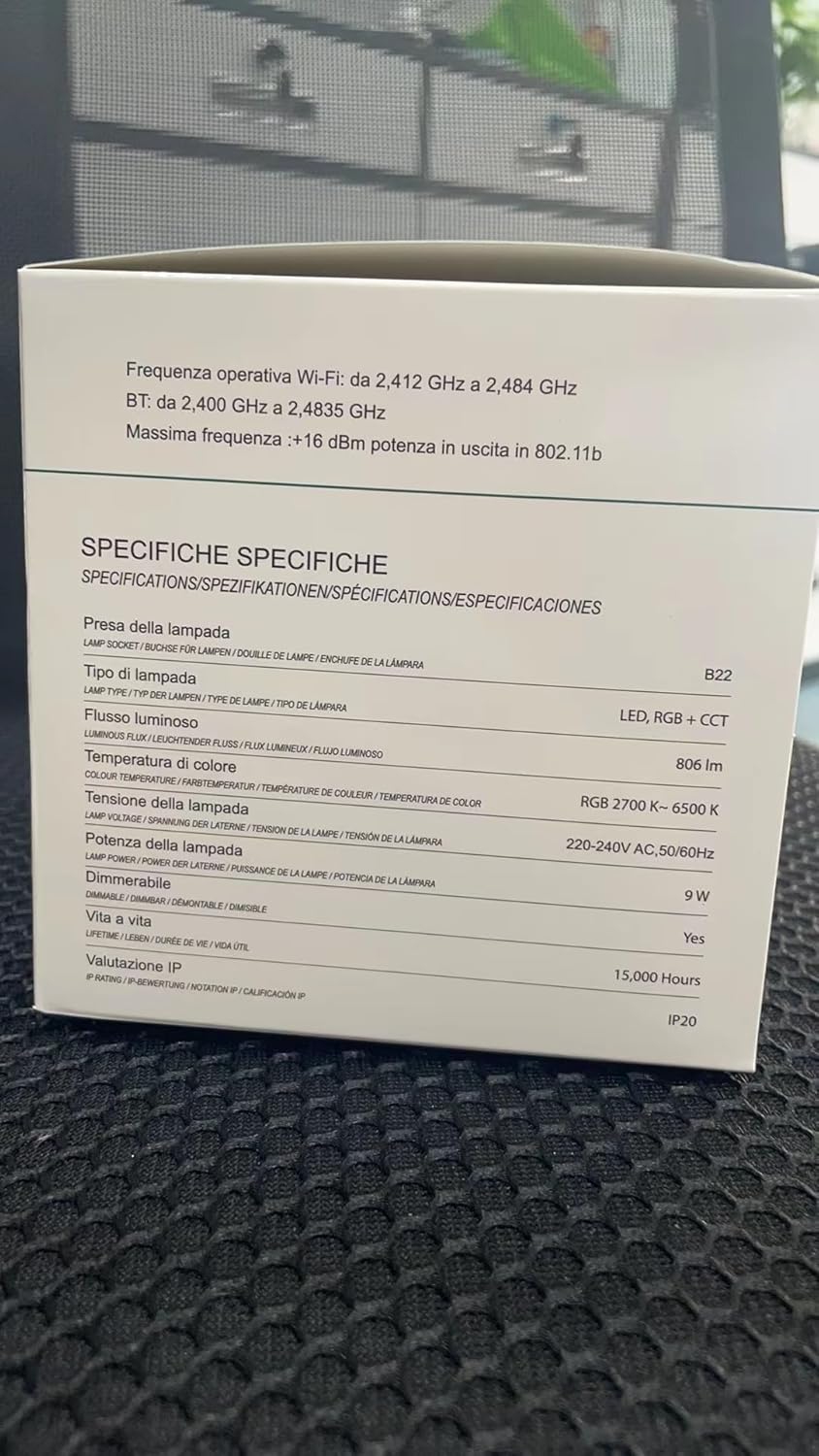 Wifi Smart Bulb Color temperature: warm light (2700k) + cold light (6500k) + RGB Dimmable: YES Colored light: YES Voltage: 230volt Power: 9W (Incandescent light 100W) Lumen: 806LM Bulb socket type: B22 WiFi type: 2.4Ghz