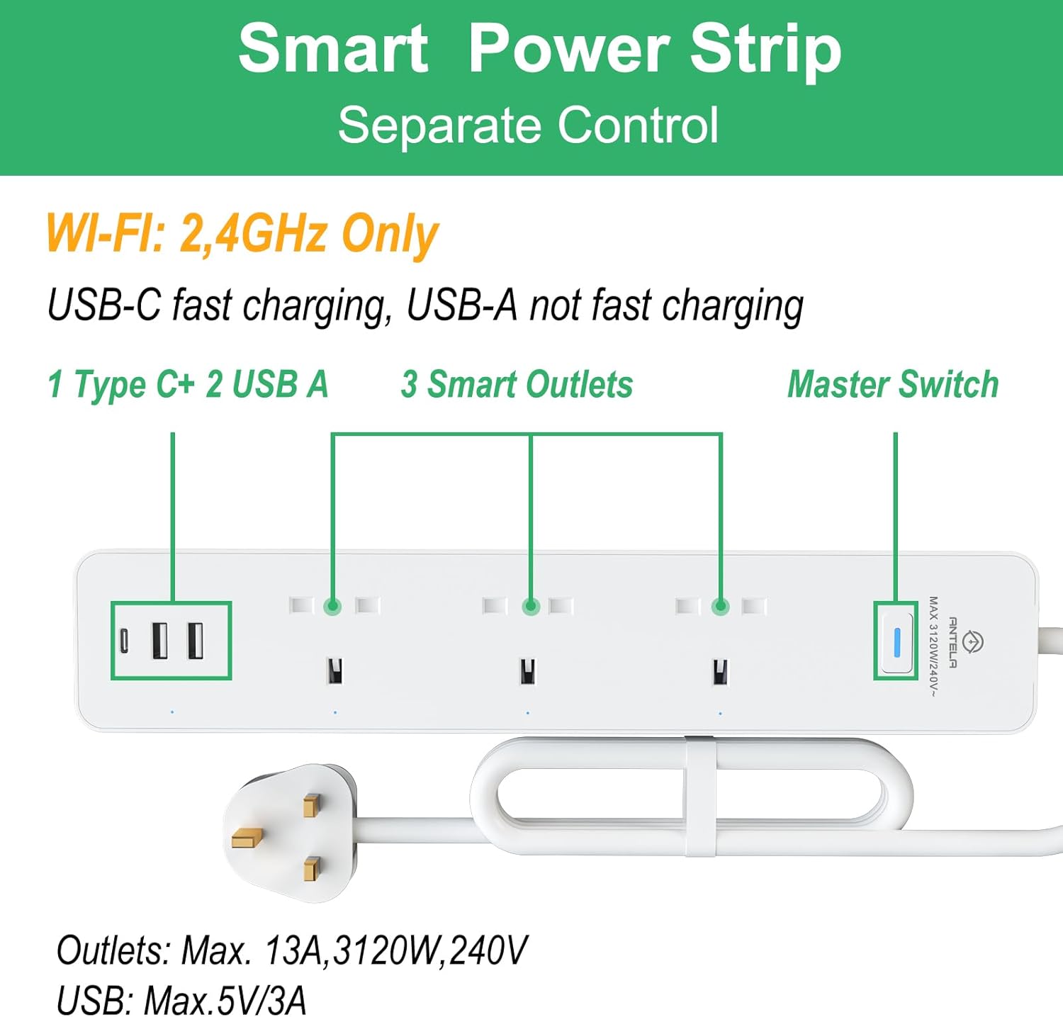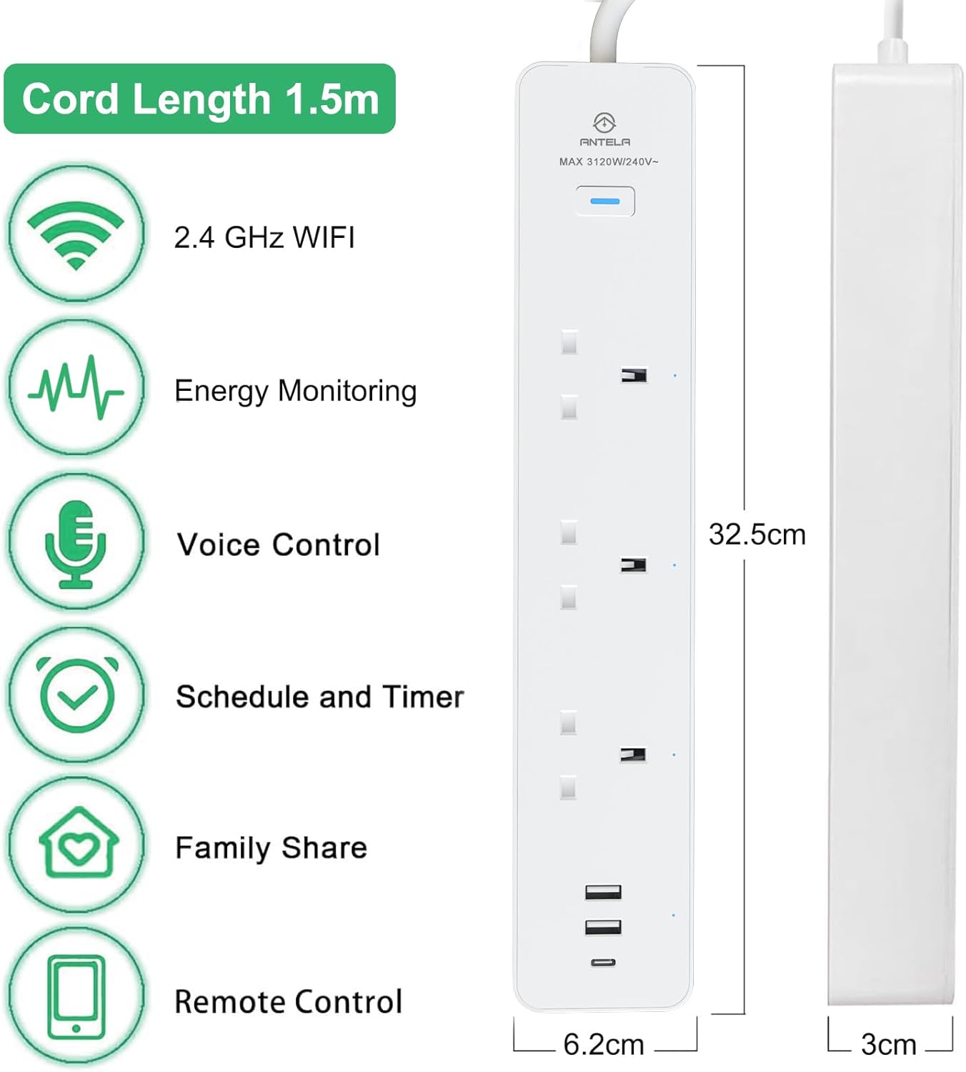 13 reviews for ANTELA Smart Power Strip Energy Monitoring, Wifi Smart Extension Lead with 3 Outlets+3 USB Ports (2 USB A+1 USB C), Work with Alexa, Google Home, Voice Control, Smart Life App, 1.5M, 2.4GHz, 13A