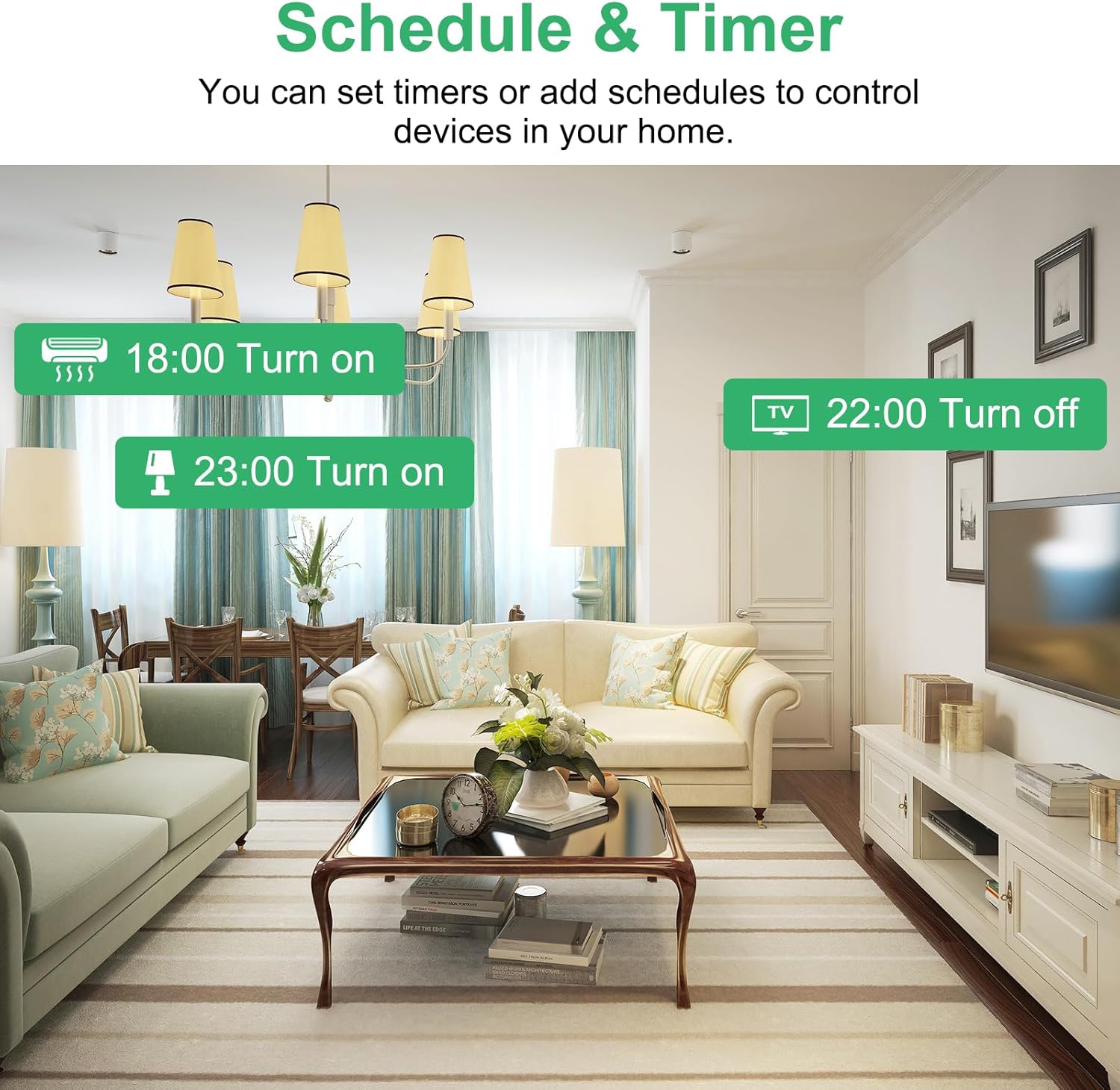 ใTimer and ScheduleใThe Alexa smart power strip can automatically schedule 3 outlets to turn on/off at the determined time. Based on your time routines, you are able to set countdown/timer/random model, and repeat the timer function daily or weekly as needed.