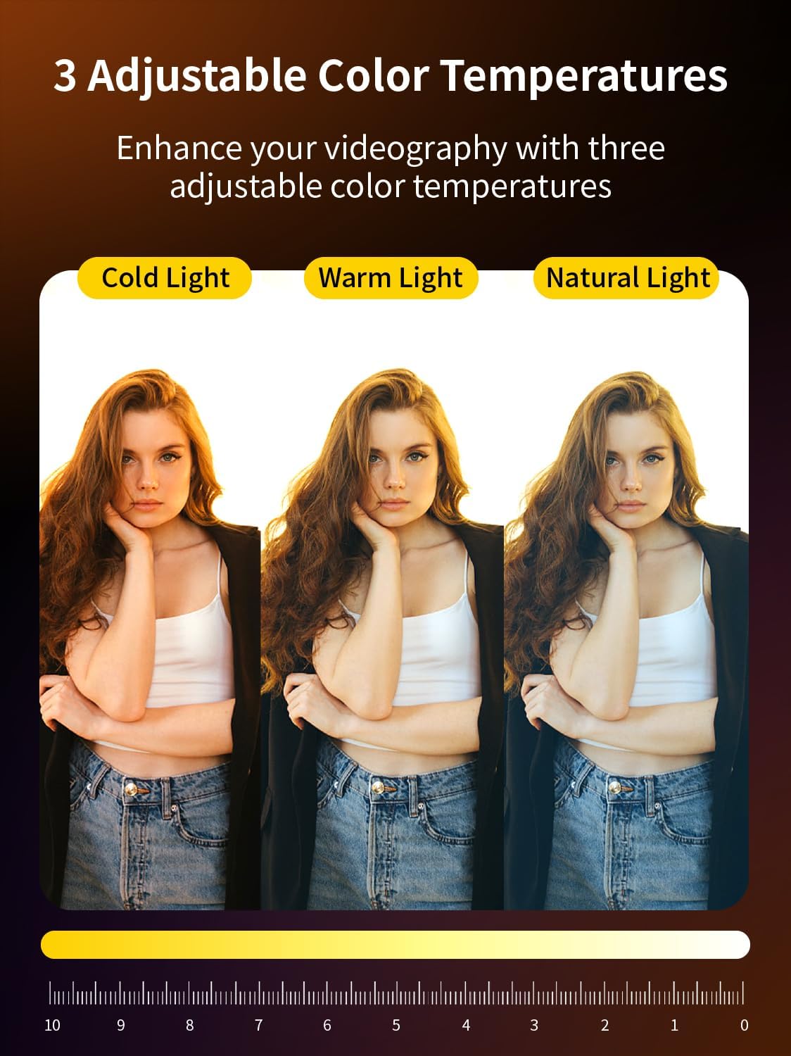 Three Adjustable Color Temperatures and Modes: Supports warm light, cool light, and natural light with three color modes to meet different lighting needs, easily creating the perfect lighting effect for any scene.