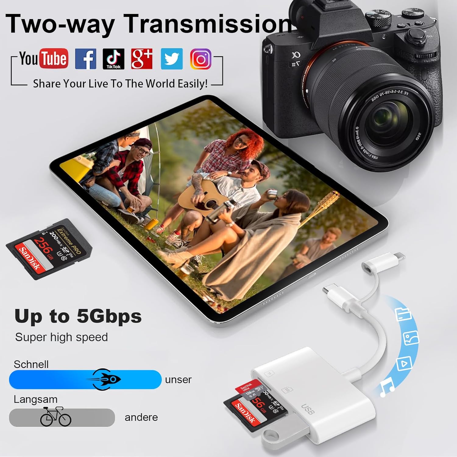 Löst nicht nur meinen Bedarf, am Macbook-Pro einen SD Card Slot und gleichzeitig einen âaltenâ USB Port, sondern auch diese Ansxhlüsse am Iphone bereitzustellen.Preis Leistung ist super