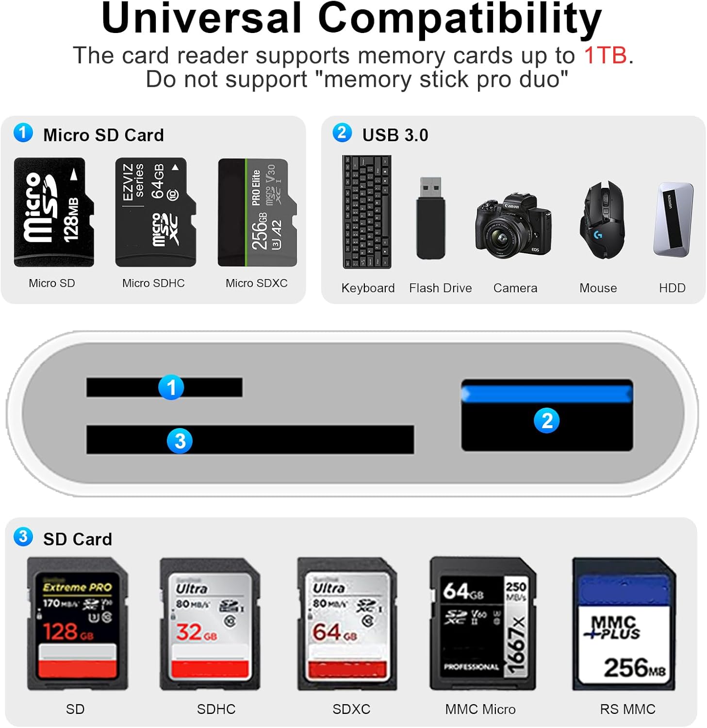 【Support Capacity & Formats】This SD/TF card reader supports SD, SDHC, SDXC, micro SD, micro SDHC, micro SDXC card of JPEG/RAW/ H. 264/ MPEG-4 format files. Do not support “memory stick pro duo”. Supports iPhone for iOS 13 or later device and type-c’s mobile phones and tablets. Note: Supports to recognizing one card and USB-A port at the same time, but SD card and Micro SD cannot be read at the same time.