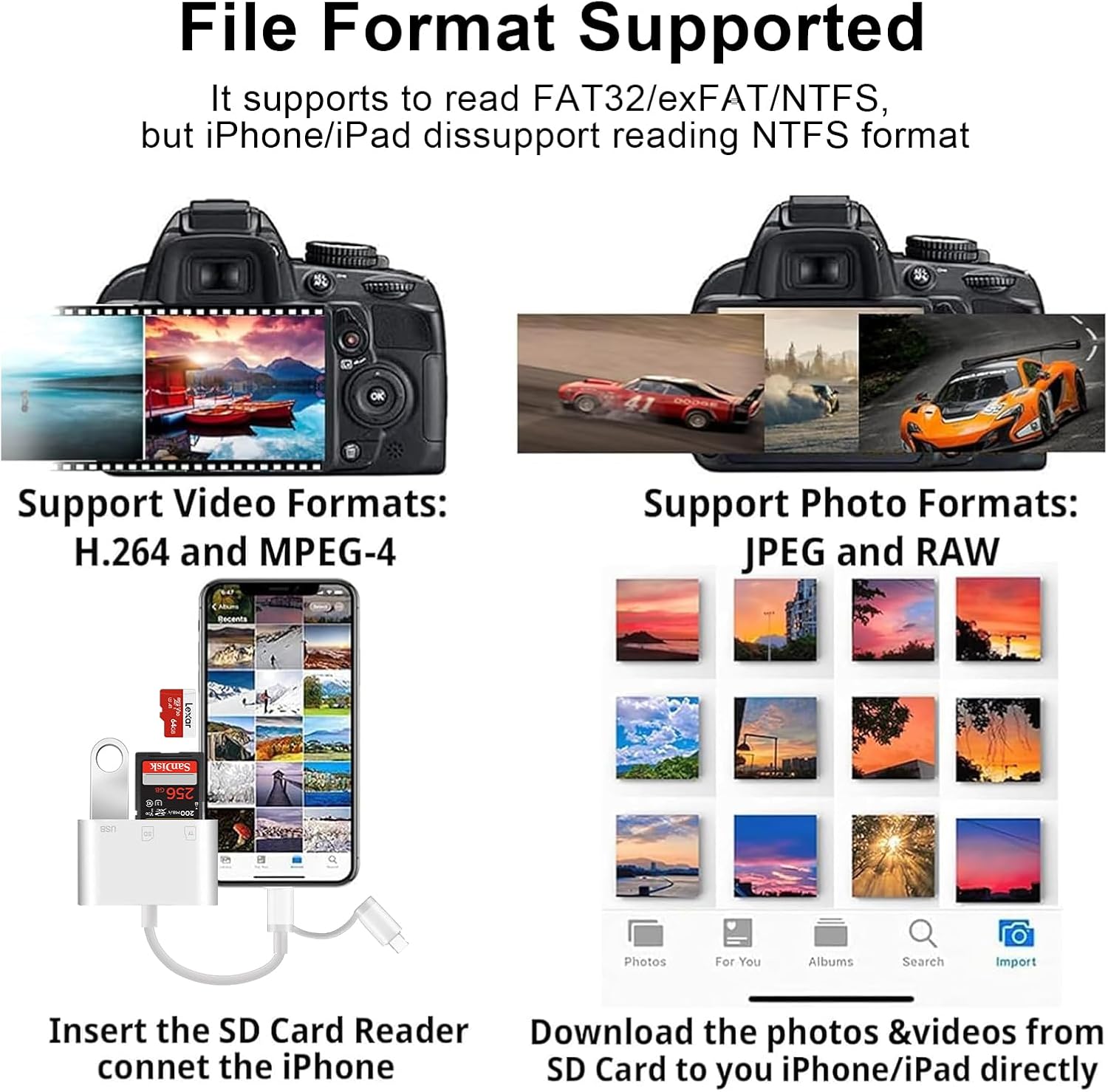 [Apple MFi Certified] SD Card Reader for iPhone, Lighitning USB C Card Reader, 3 in 2 SD Card Reader with SD/Micro SD/USB3.0, Camera Memory Card Reader for iPhone16 15/iPad/Android Samsung/Camera