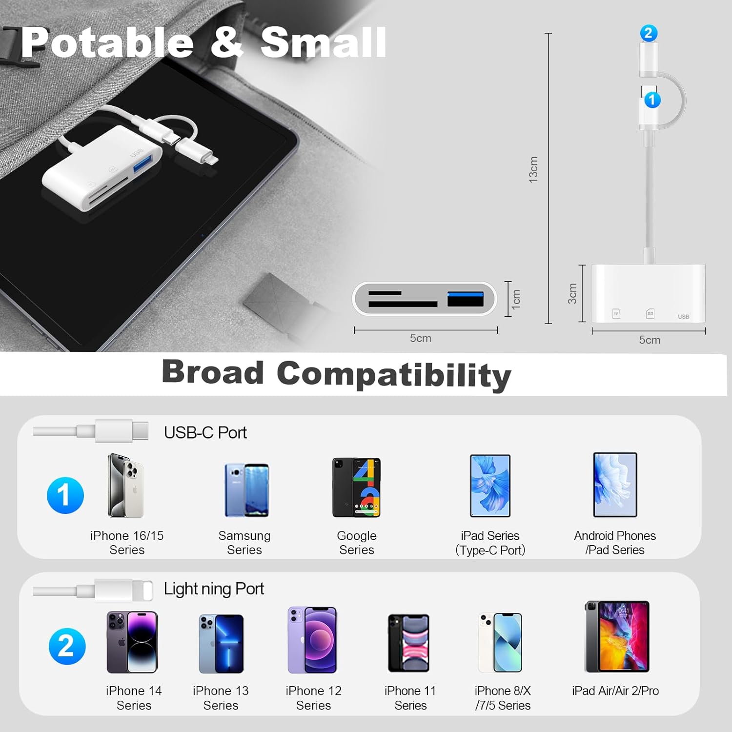 【Excellent Compatibility】The memory card reader is compatible with Lightning interface devices such as iPhone 14/14 Pro/13/13 Pro/12/12 Pro/11/11Pro/XS/XS Max/XR/8/7 and iPad and more other iOS interface devices. Compatible with Type-C devices such as iPhone 15/15 Plus/15 Pro/15 Pro max, iPad(type-c port), Galaxy, HUAWEI, Xiaomi, Redmi Note and more USB-C devices. Suit for various kinds of Dash Cam/Trial Camera/Digital Camera memory cards. [We will provide you with a satisfactory solution within 24h if you encounter any problems when using it.]